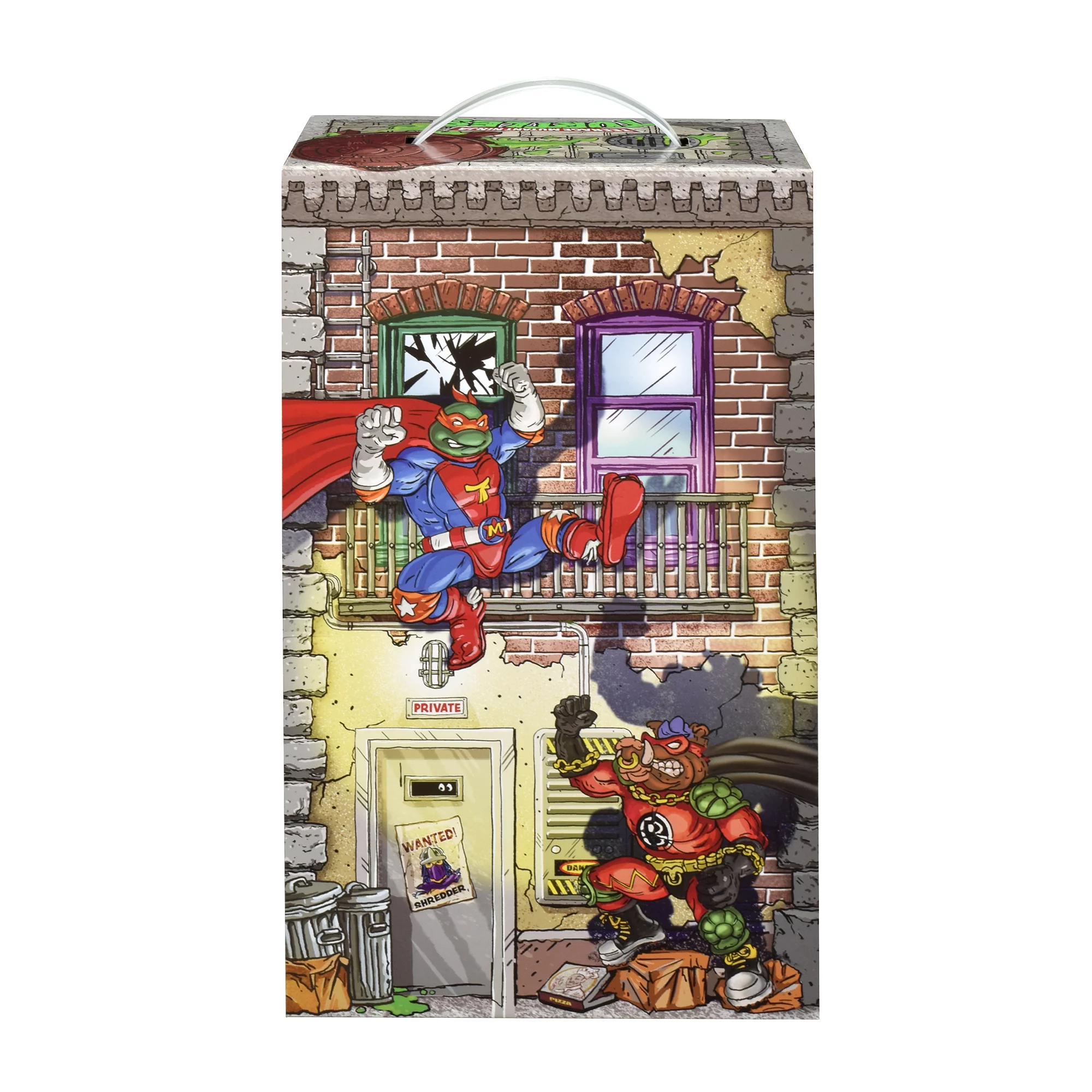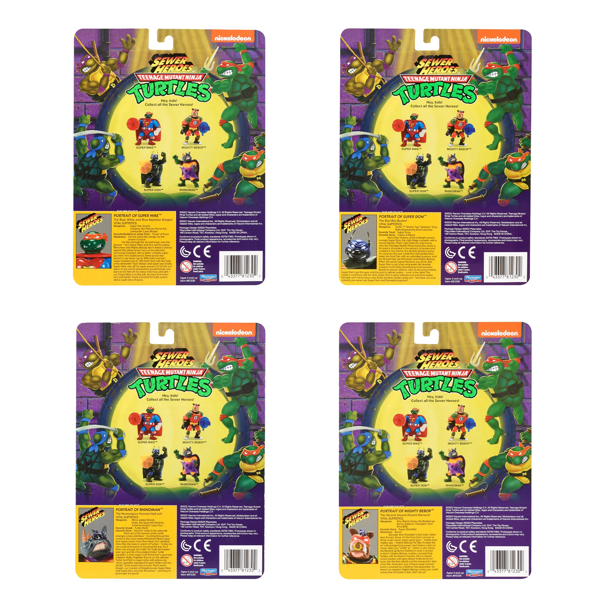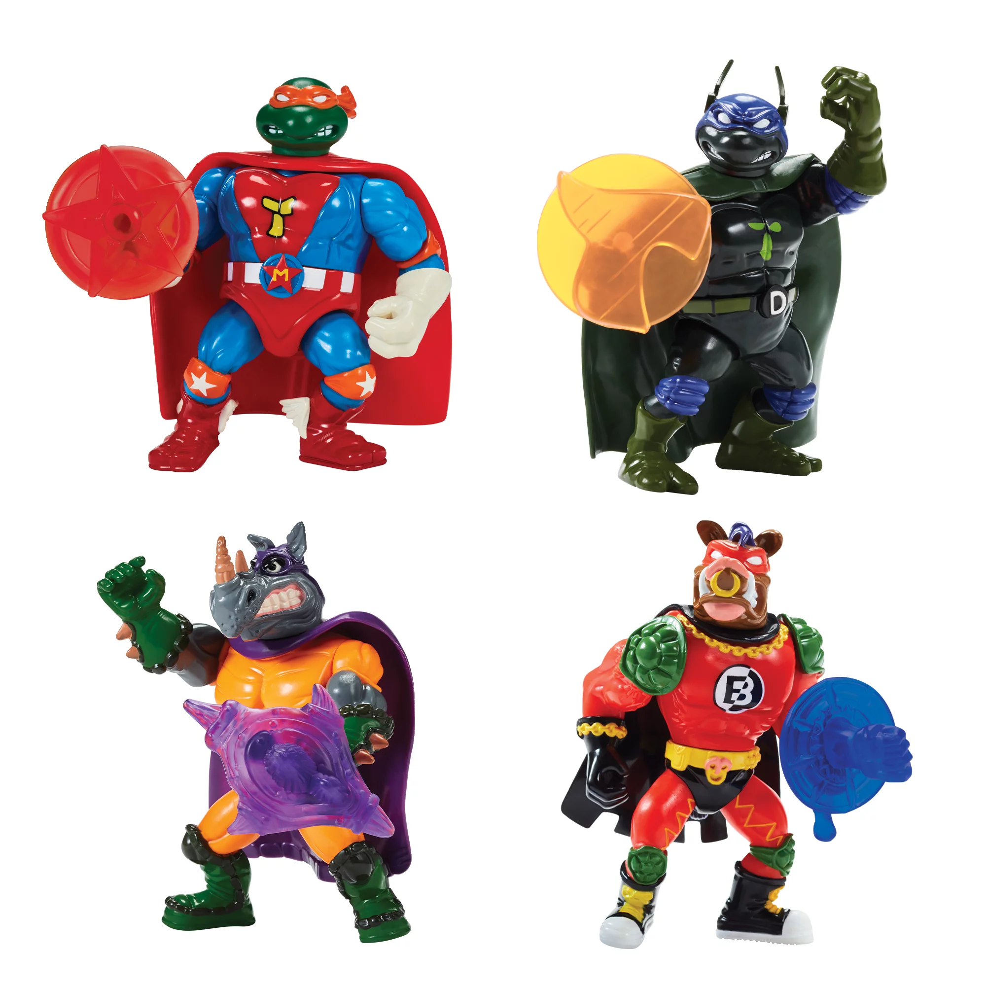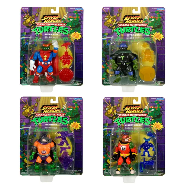 This retro TMNT sewer set comes with Super Mike (The Red, White and Blue Reptilian Ranger), Super Don (The Bad Boy Buster), Mighty Bebop (The Muscle-Bound Mutant Menace) and Rhinoman (The Humongous Horned Half-Wit). Each figure comes in their classic Sewer Heroes branded blister card, and includes an exclusive set of accessories, outfits and a sidekick.