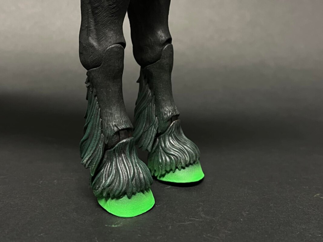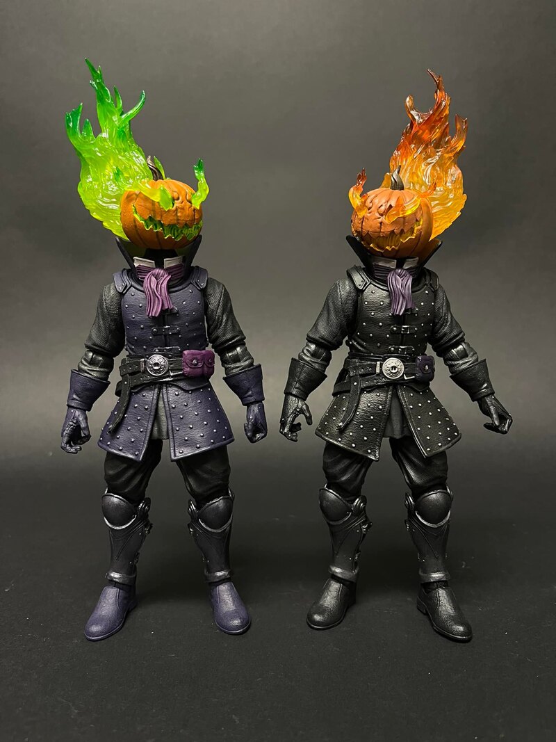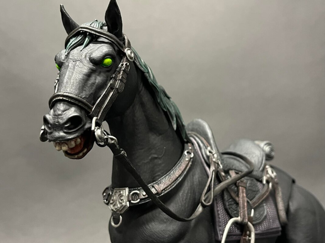 The Headless Horseman, which is a part of a 2-pack set of horseman and horse, is a part of the Figura Obscura collection (if you haven’t already done so, click here to read about this really cool line). The initial version of the Headless Horseman was a limited release timed with Halloween 2022. In this new release, the Horseman has been repainted with more purple on the “leather” part of the pants and with a deep orange interior on the cape. The flames on the pumpkin head are now a ghostly green. The Horse has the same build as the one in the first release but now has green accents in place of the original red ones. Its eyes and green hooves glow in the dark. [Four Horseman released new images of the Horse figure on its Facebook page today.]