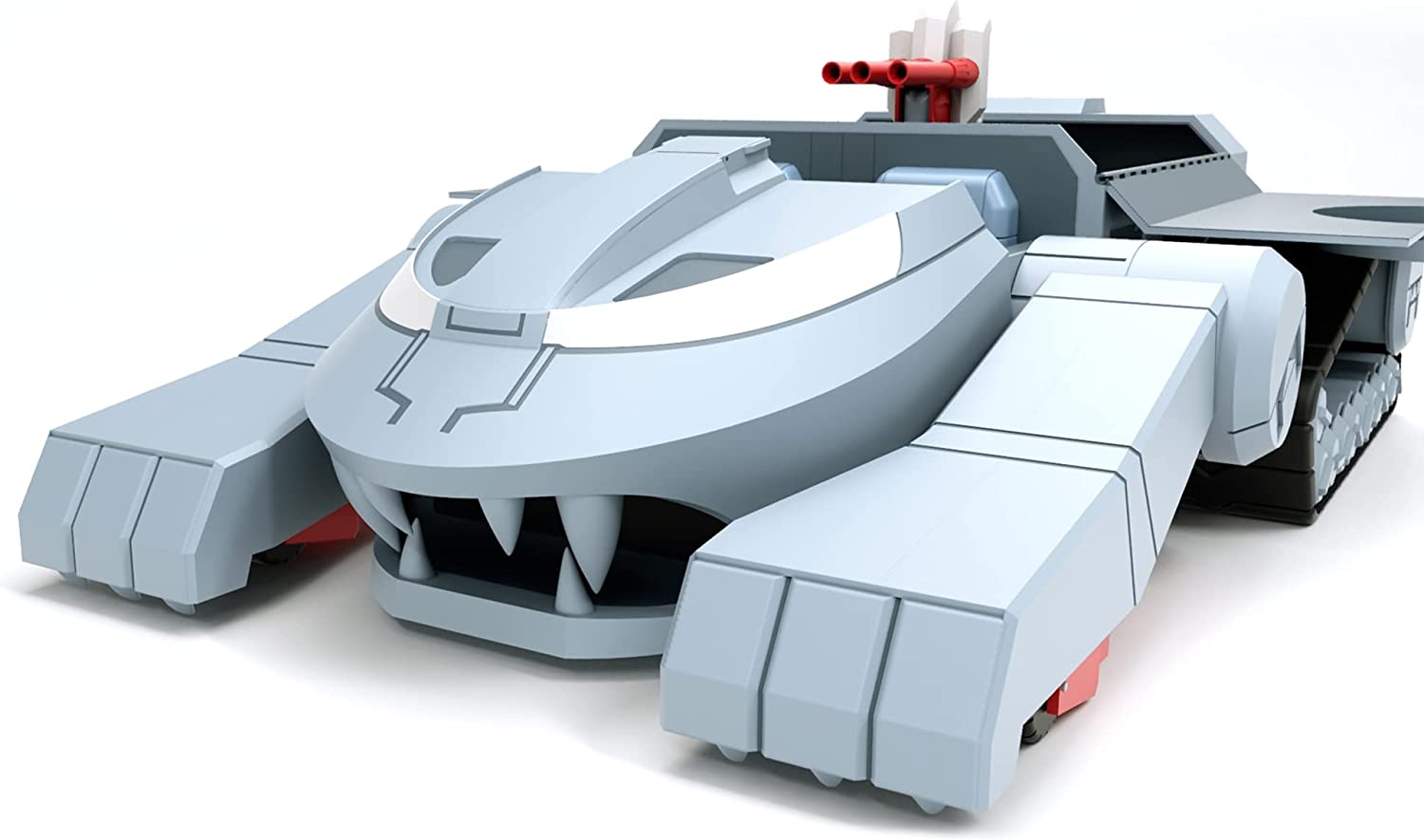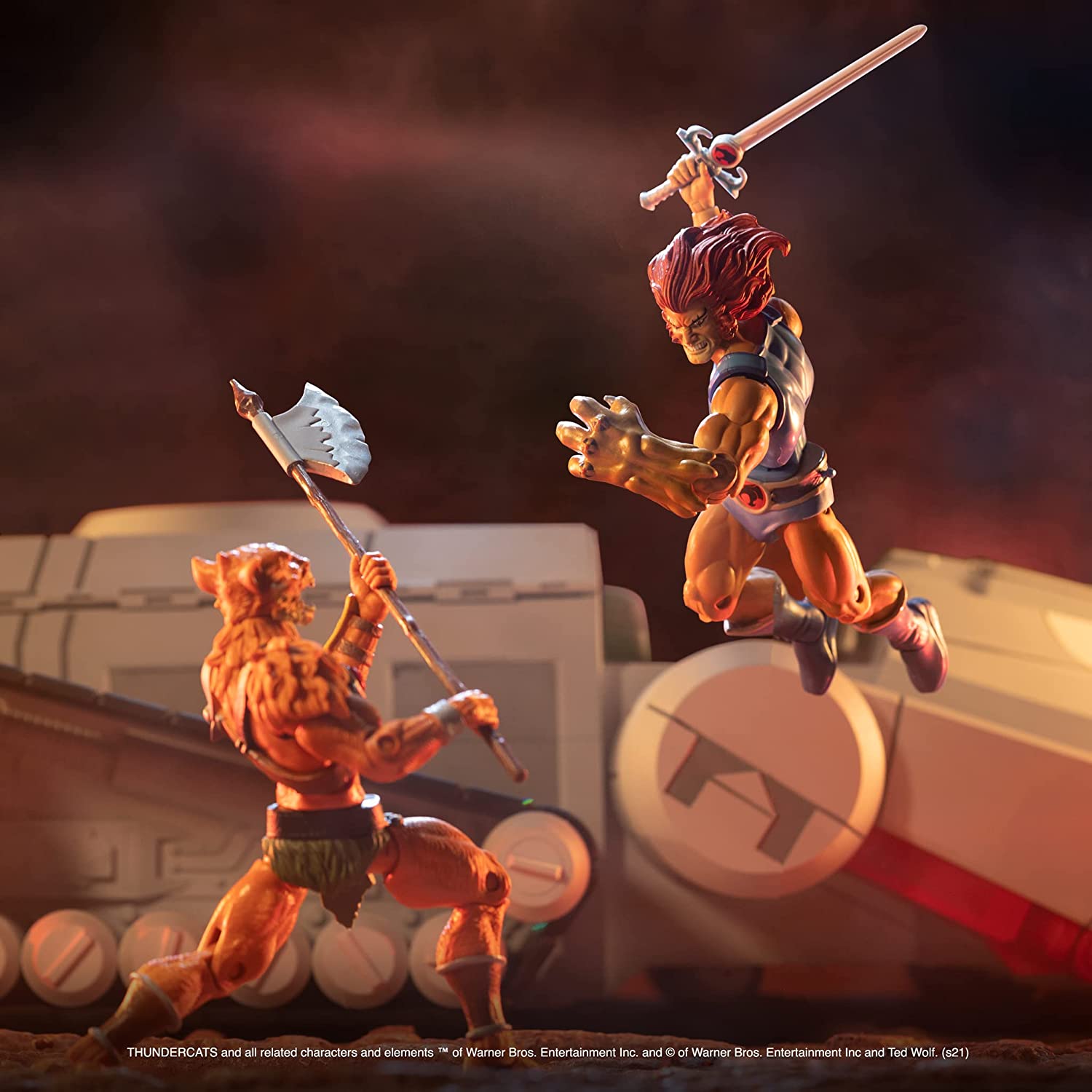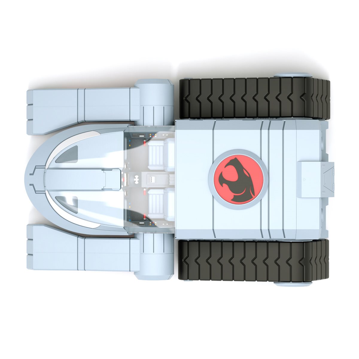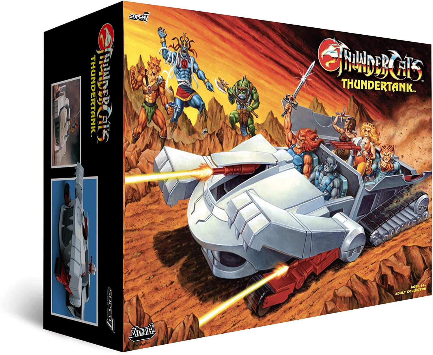 The Ultimates ThunderTank features cartoon deco, a mechanical jaw, rolling wheels, opening cargo bay doors, glow-in-the-dark eyes, and more. At 27-inches long and 17-inches wide, this take is able to carry up to six ThunderCats Ultimates figures and can even fit four of the original ThunderTanks inside.