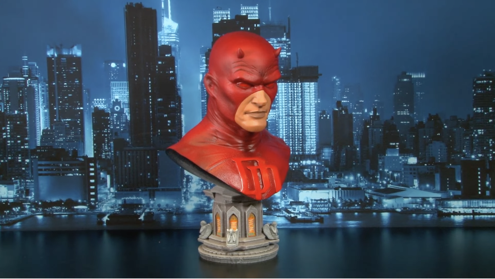 - Marvel Comic Daredevil in 3-D 1/2 Scale Bust: Wearing red outfit with a church-themed base; $175.00; Coming Summer 2023.