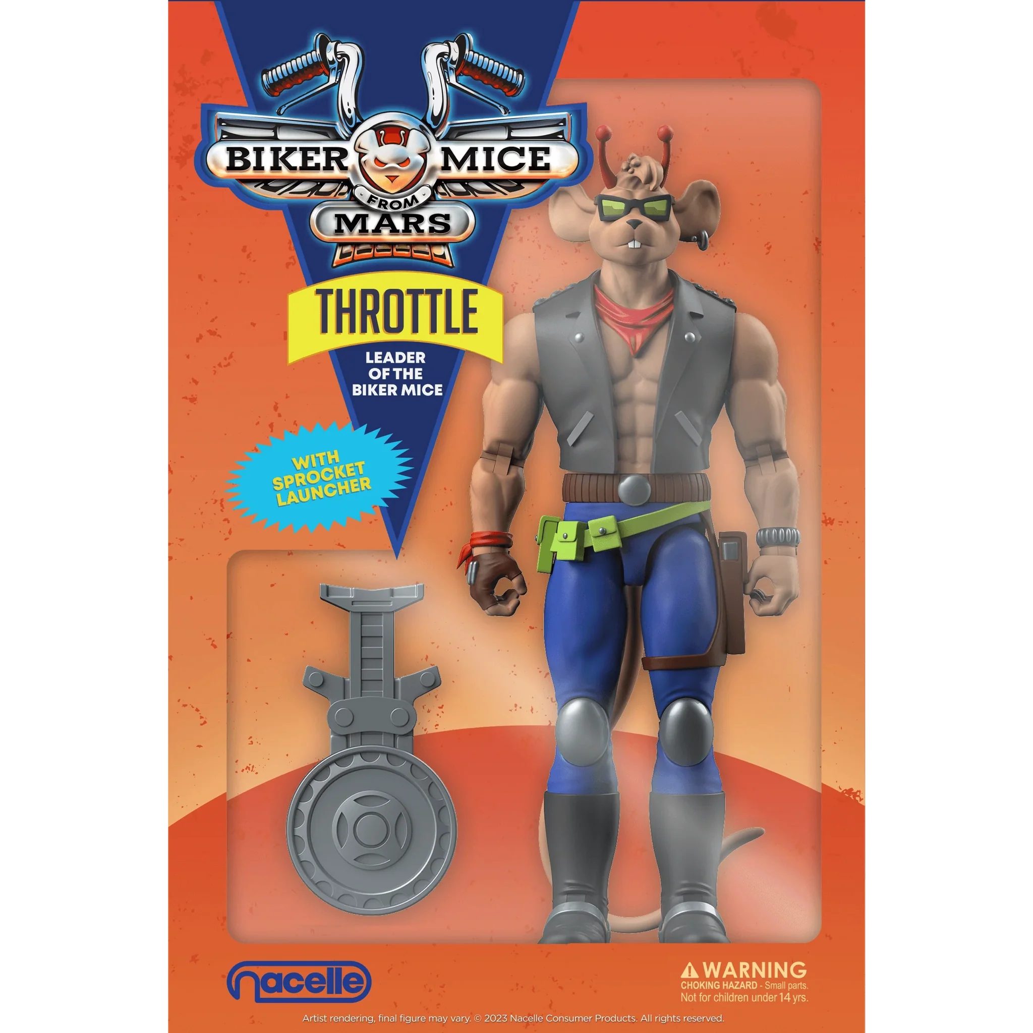 Biker Mice from Mars Throttle 7-Inch Scale Action Figures $35.99; October 2023. This 7-inch tall Throttle figure has 15 points of articulation. It comes with an interchangeable helmet, a sprocket launcher accessory, and is packaged in a collector’s box. [Entertainment Earth]