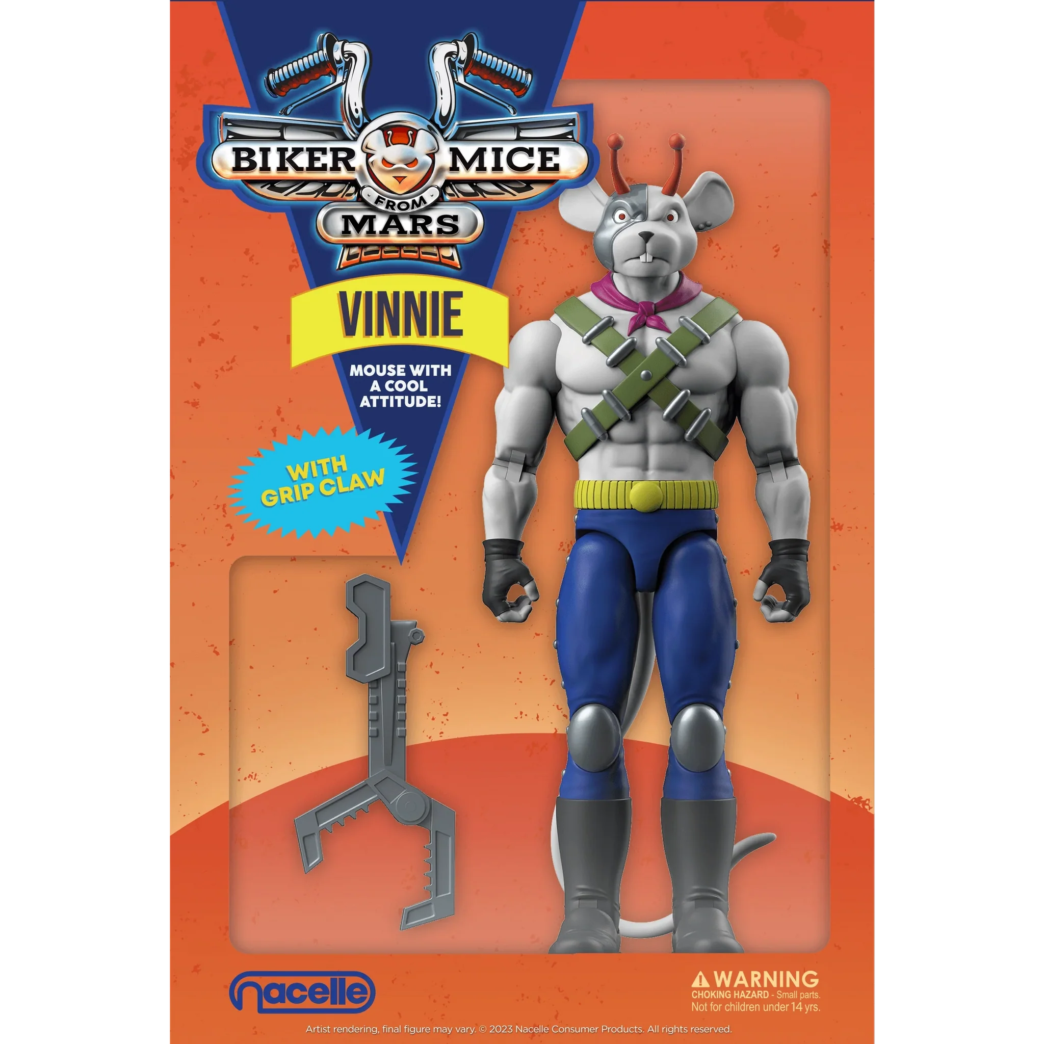 Biker Mice from Mars Vinnie 7-Inch Scale Action Figures $35.99; October 2023. This 7-inch tall Vinnie figure has 15 points of articulation. It comes with an interchangeable head with helmet, a Grip Claw accessory, and arrives packaged in a collector’s box. [Entertainment Earth]