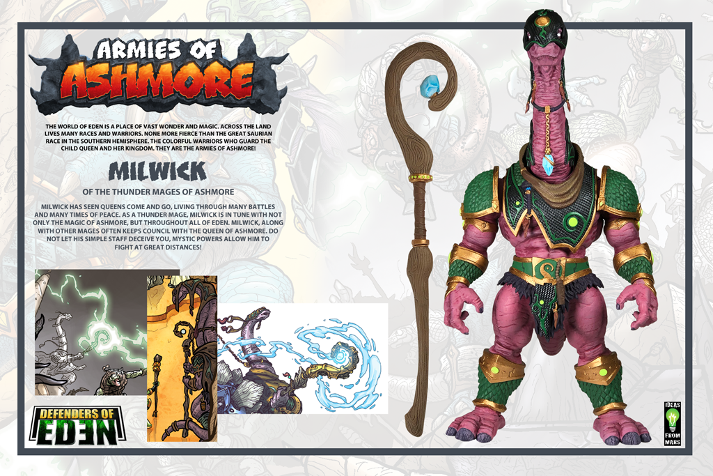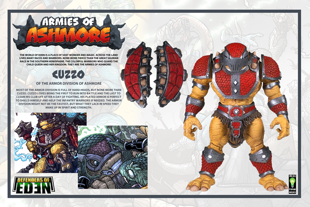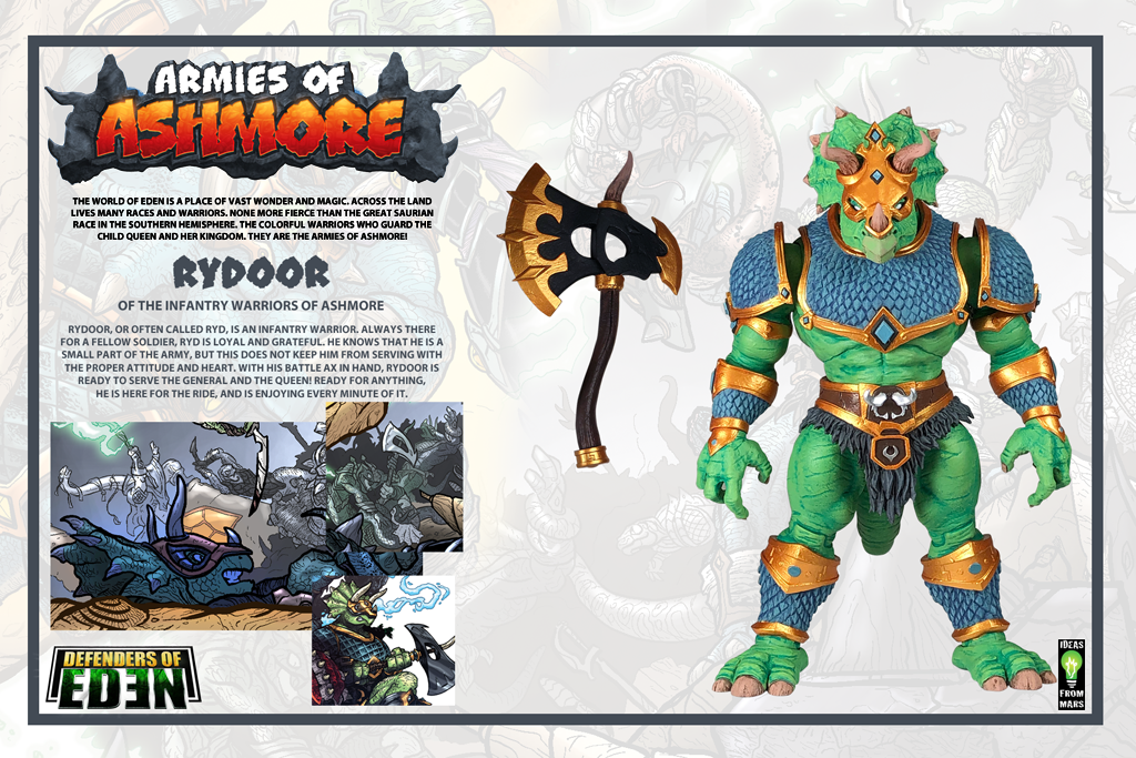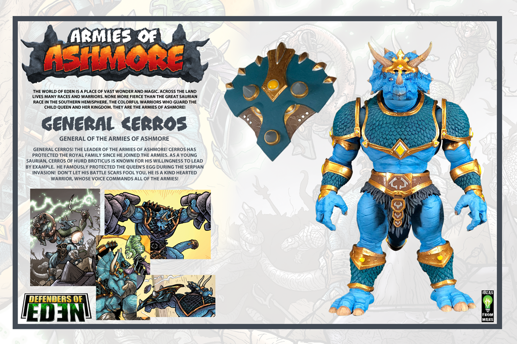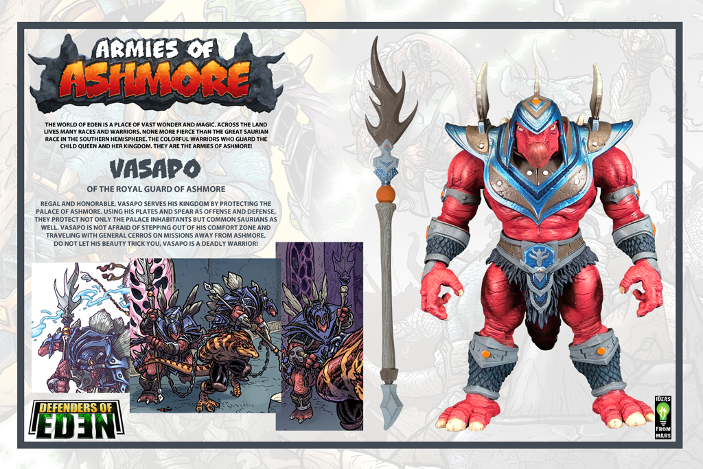 Based on the Defenders of Eden, comic books, The Armies of Ashmore is wave one from the toy line. The dinosaur warrior figures have removable heads, tails, hands, and armor. Wave one includes 5 different Saurian warriors who reside in the Kingdom of Ashmore, located in the world of Eden: General Cerros, Vasapo, Milwick, Rydoor, and Cuzzo.