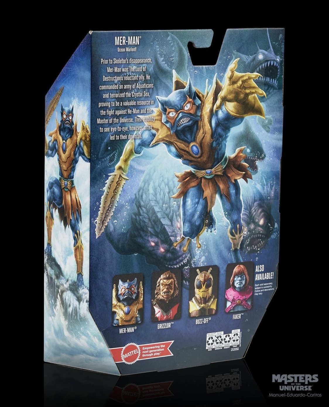 Packaging and artwork for MOTU’s Mer-Man, Grizzlor, & Buzz-off: