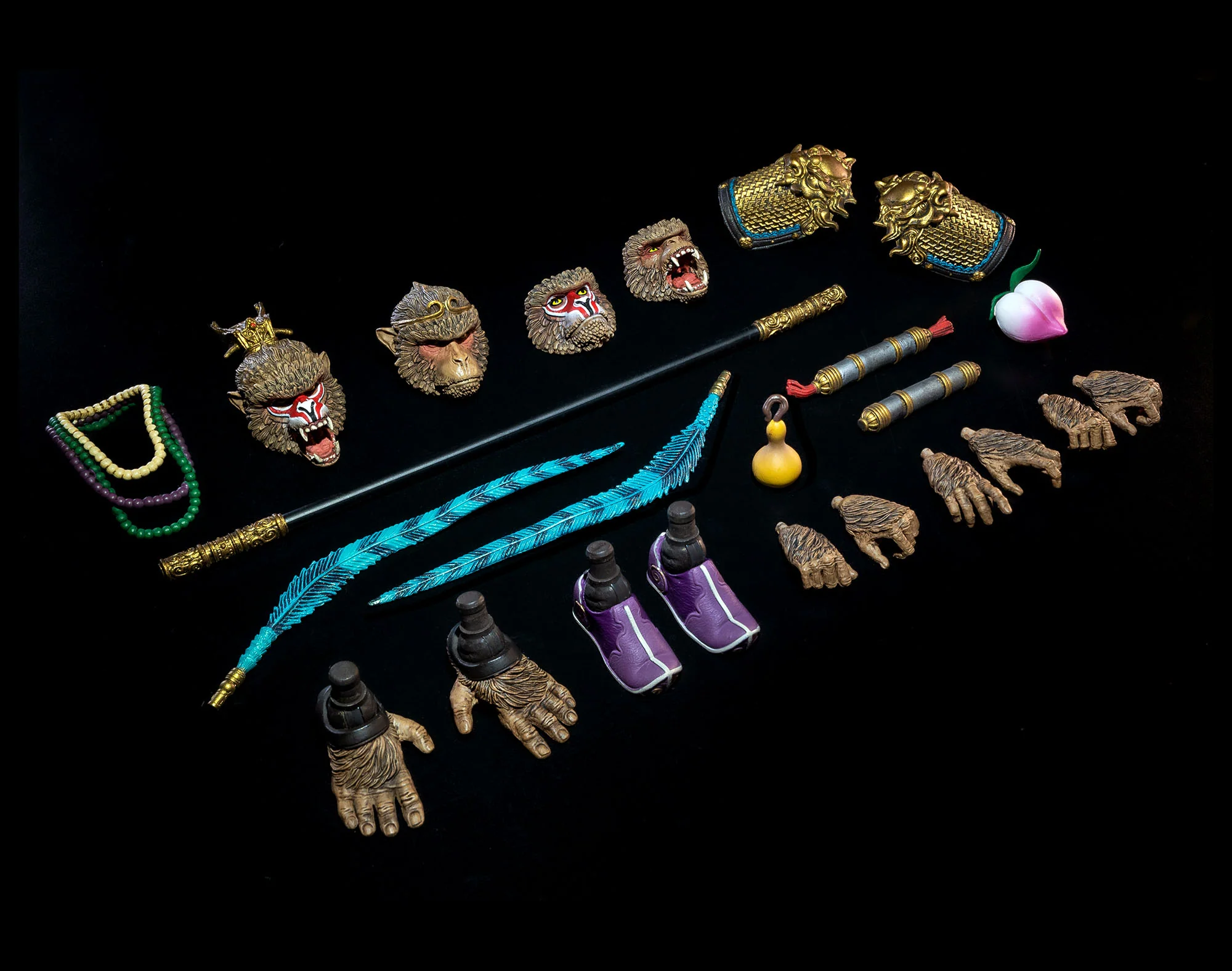 Sun Wukong, The Monkey King is priced at $60. It comes in a 4-color window box package with a removable background display cover and character-specific packaging details. Dressed in soft goods robes, it also comes with alternate head sculpts, hands, and feet as well as character-specific accessories.