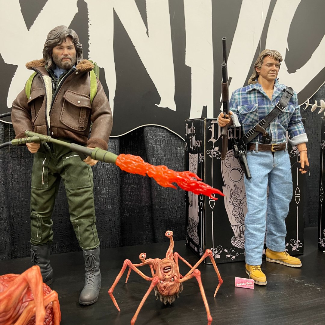 No details were shared other than the images. The MacReady figure is pictured with the Norris Spider Head Thing, a famethrower, and the Dog Thing. The Nada figure is pictured with a shotgun, ammo belt, pistol, and sunglasses.