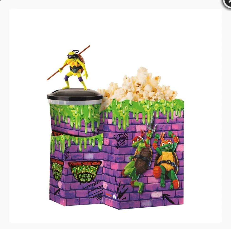 Over on Reddit, a user named u/WorthCampaign5860 posted images of movie theater concession merchandise for the upcoming Teenage Mutant Ninja Turtles: Mutant Mayhem, with the caption, “Hopefully US theaters get these in.”