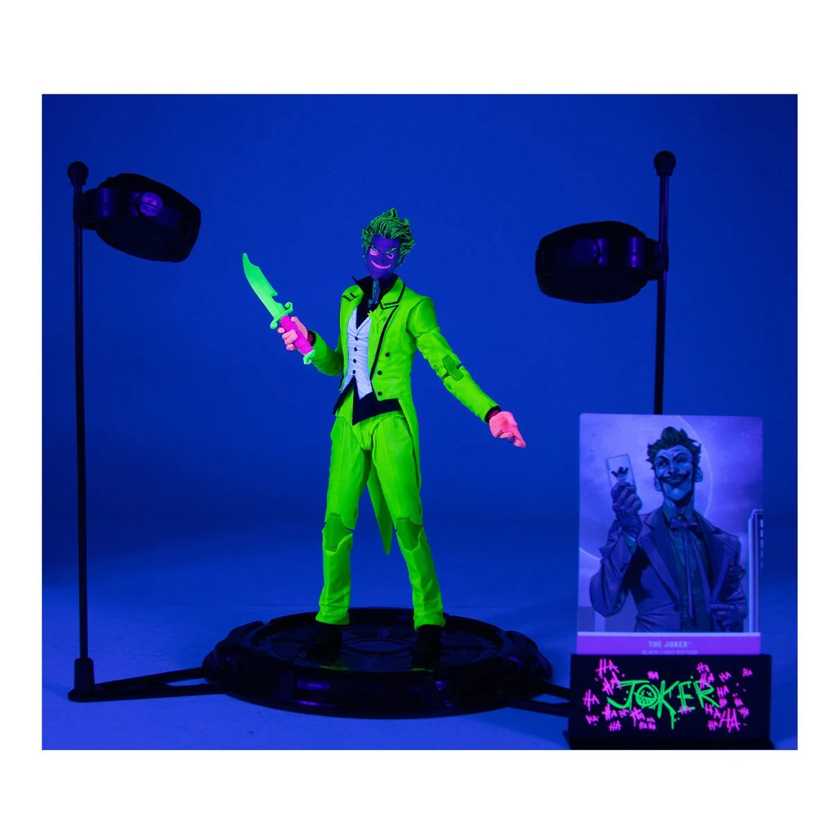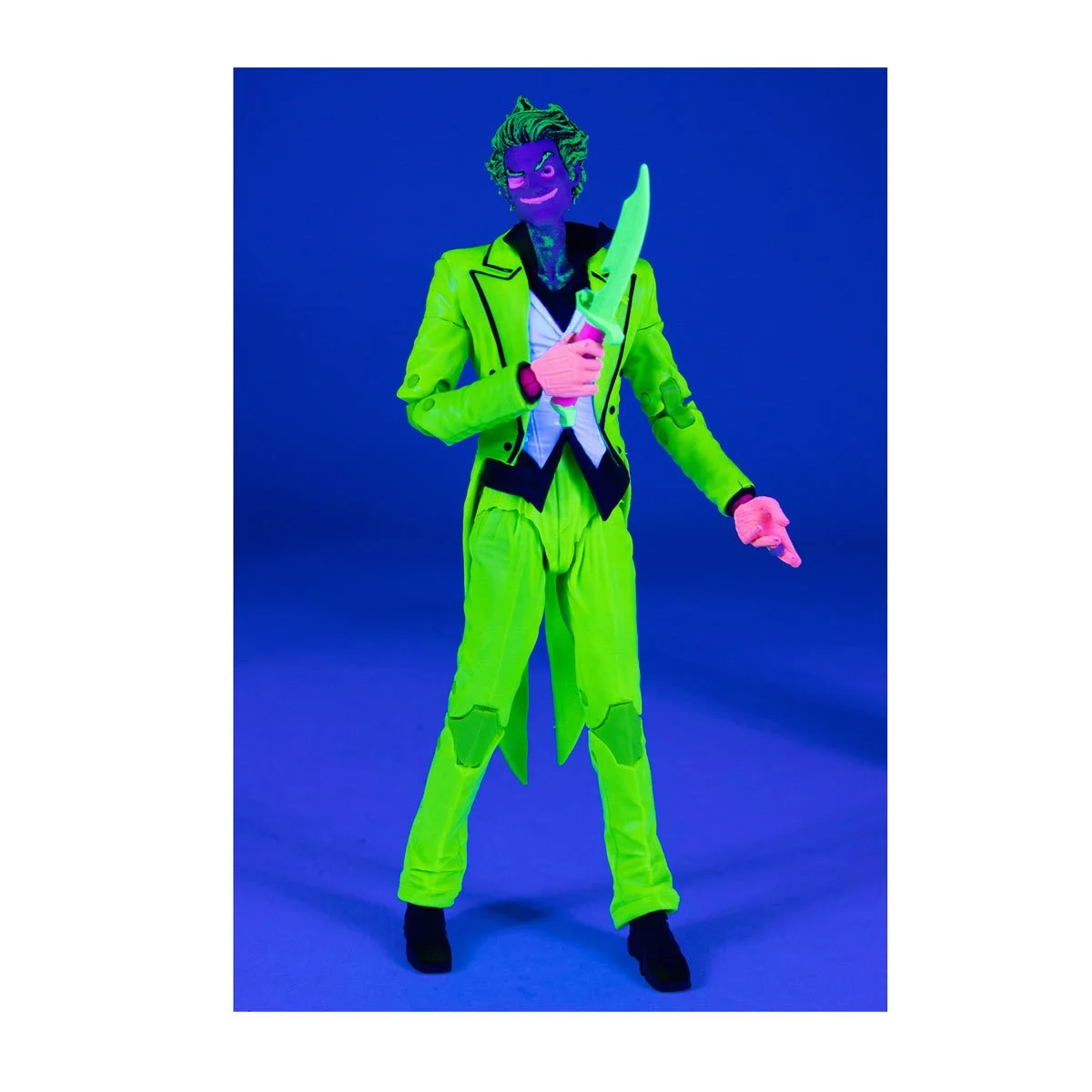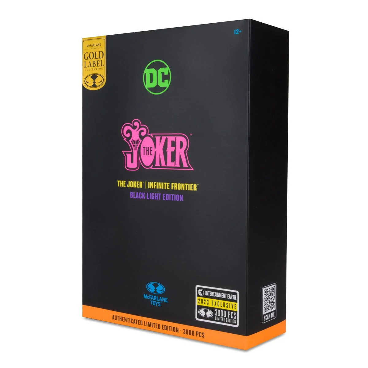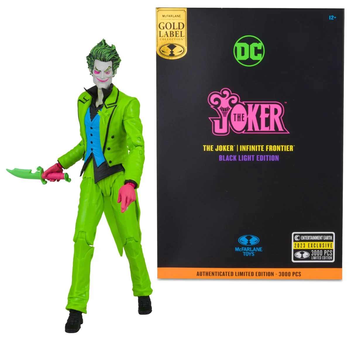 DC Multiverse The Joker Infinite Frontier Black Light Gold Label 7-Inch Action Figure – Entertainment Earth Exclusive $29.99; July/August 2023; Inspired by DC Comics’ Infinite Frontier, this 7-inch black-light deco’d Joker figure is a limited edition of 3,000 pieces. He includes a knife accessory, a black light base with two battery-powered black lights, an exclusive card stand, and a collectible card with a Joker illustration on front and a certificate of authenticity on the back. It is fully articulated. Recommended for ages 12 and up.