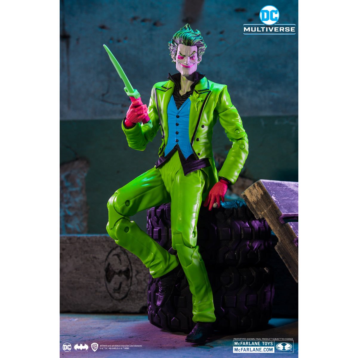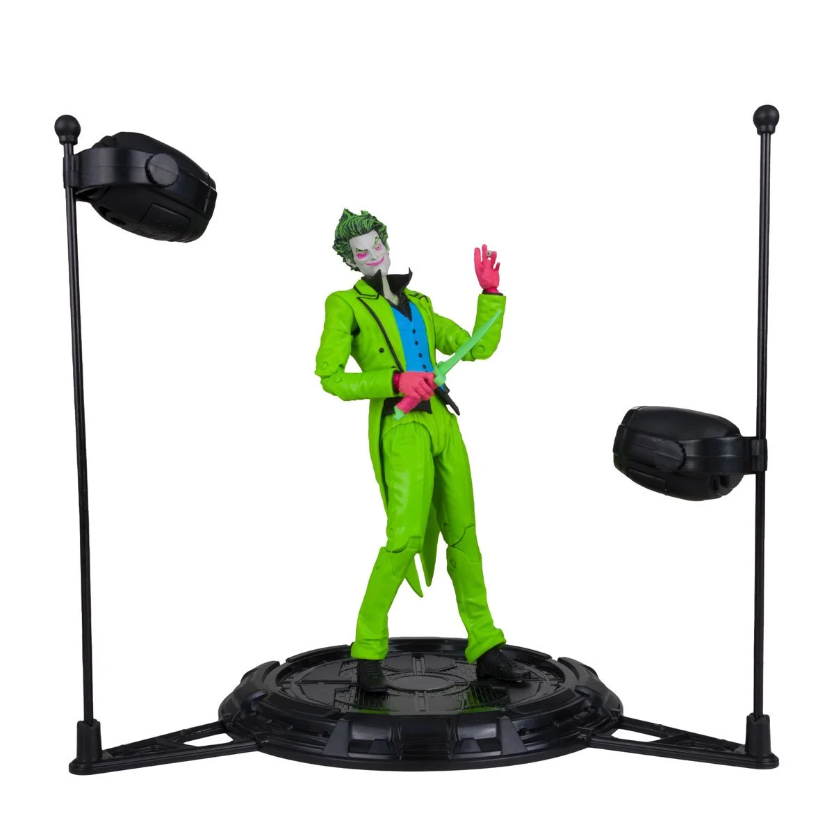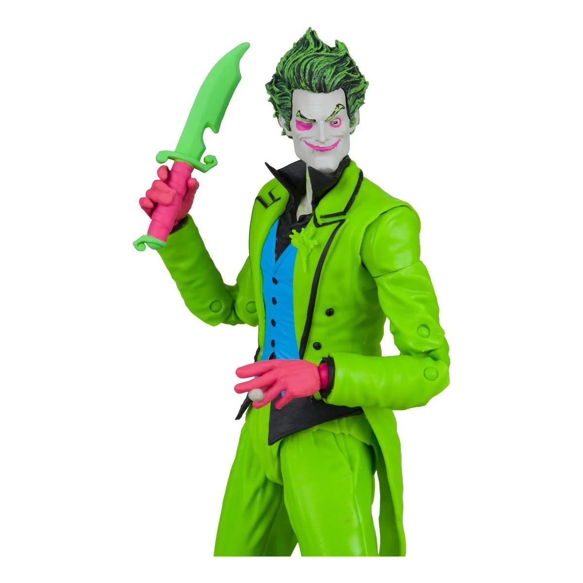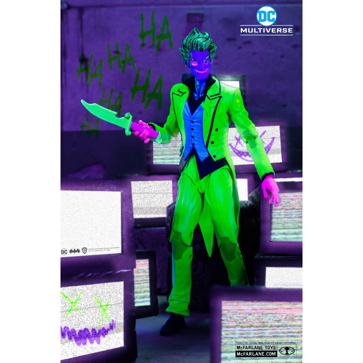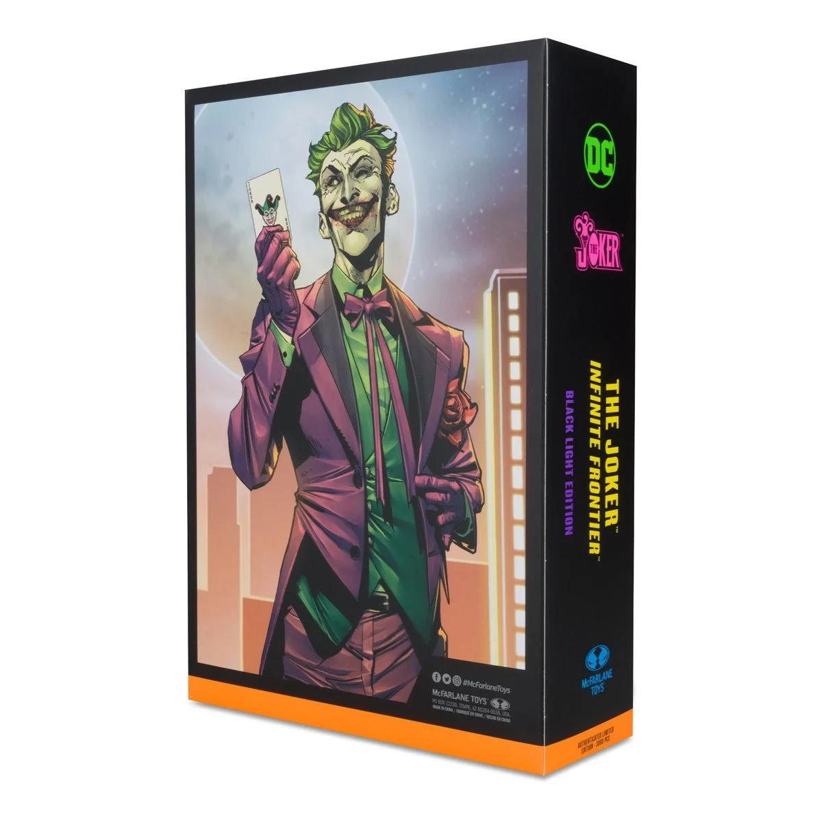 DC Multiverse The Joker Infinite Frontier Black Light Gold Label 7-Inch Action Figure – Entertainment Earth Exclusive $29.99; July/August 2023; Inspired by DC Comics’ Infinite Frontier, this 7-inch black-light deco’d Joker figure is a limited edition of 3,000 pieces. He includes a knife accessory, a black light base with two battery-powered black lights, an exclusive card stand, and a collectible card with a Joker illustration on front and a certificate of authenticity on the back. It is fully articulated. Recommended for ages 12 and up.
