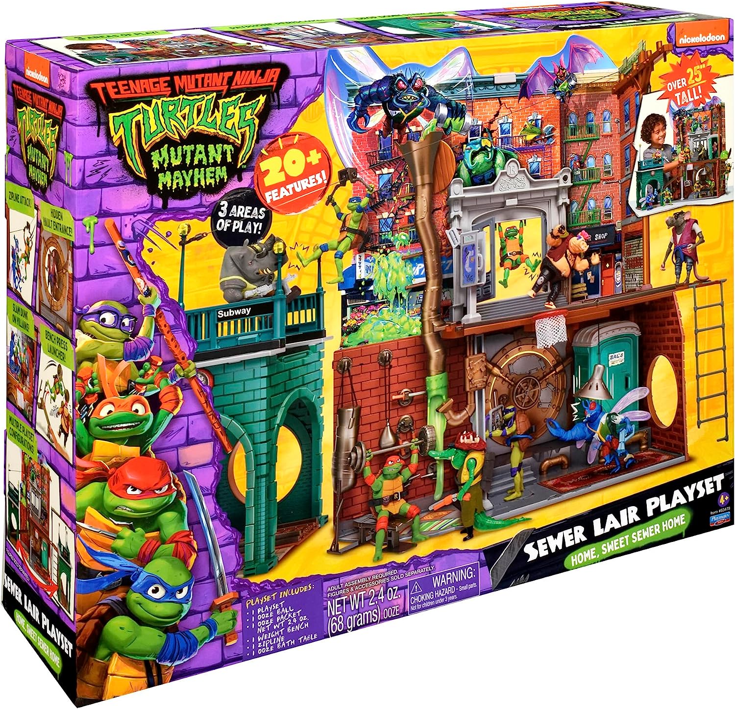 - Has over 20 different features for play, including a dojo for training, zipline to ride from skyline to street level, porta potty elevator to get down into the sewers, a secret vault door, slides, and false floors