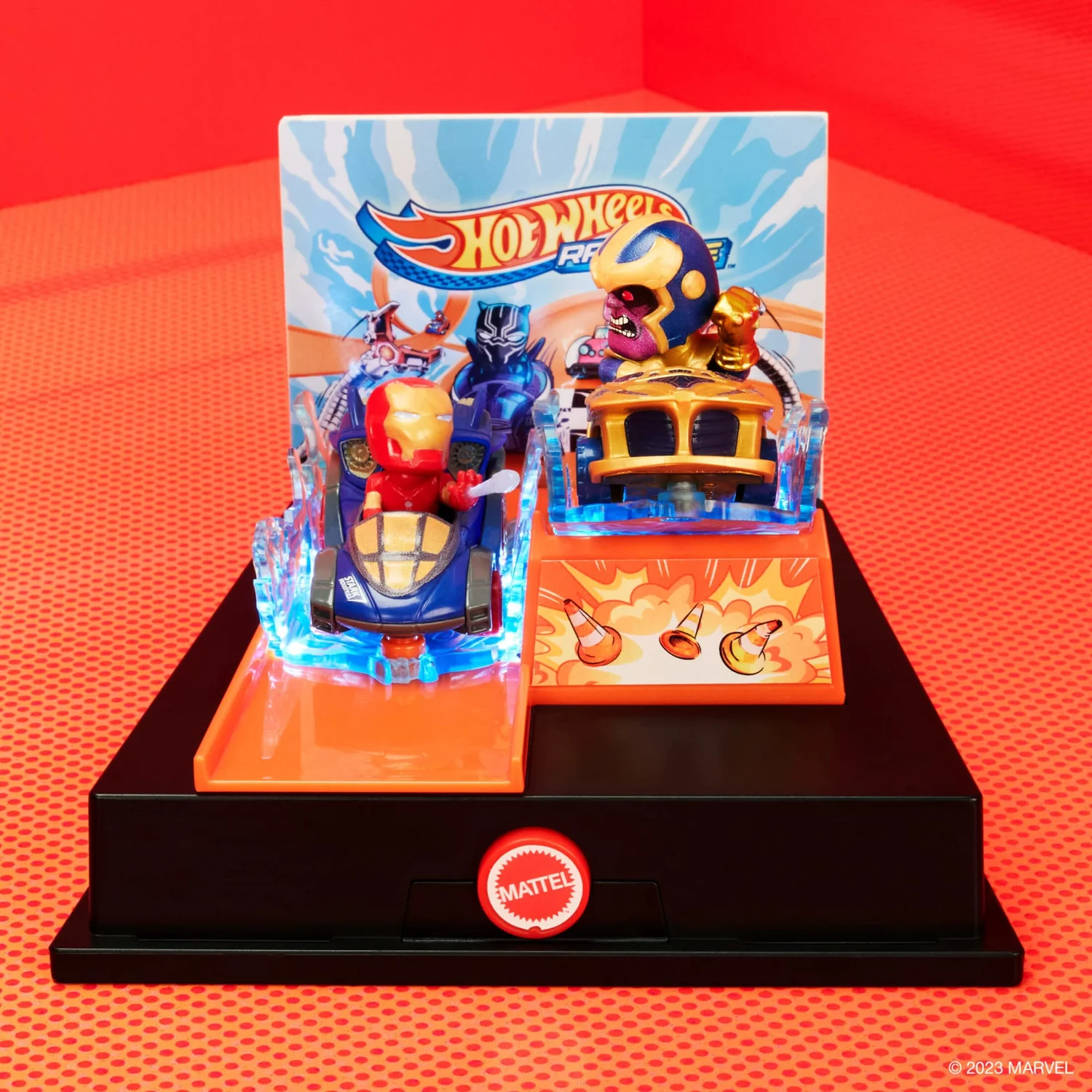 Hot Wheels RacerVerse with this Marvel 2-pack Set $40; This 2-pack marks the debut of Mattel’s new RacerVerse series and features 1:64 versions of Iron Man and Thanos in their RacerVerse vehicles. Iron Man has a blaster beam and Thanos has the Infinity Gauntlet. The base has electronic light-up features, orange track, and colorful background. The set is protected in an acrylic case.
