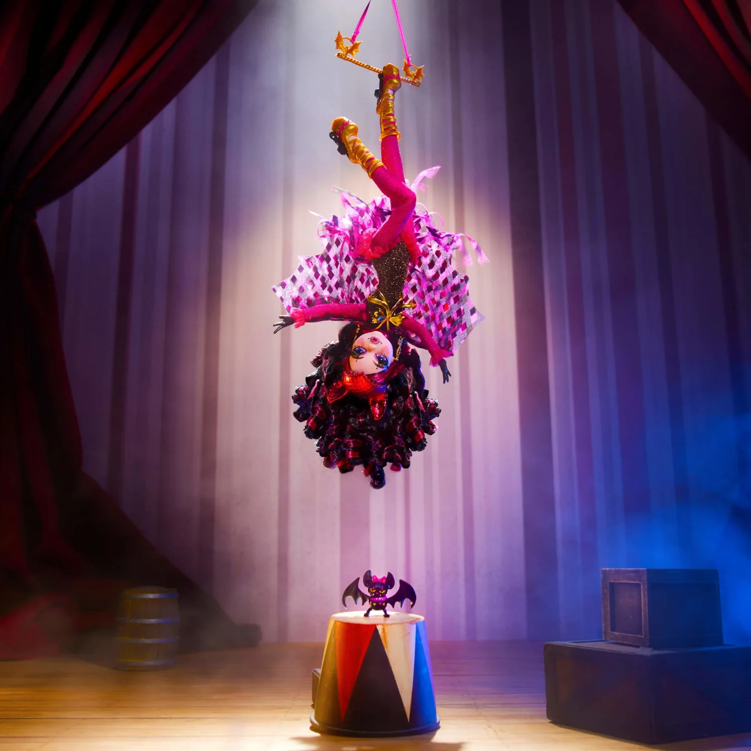 Monster High Freak Du Chic Draculaura Figure $75; This fully articulated Freak Du Chic Draculaura Doll is featured in a layered shimmer bodysuit with bow bodice, bat wings, and accent ruffles. She also has stylized makeup framed by boo-tiful curls, golden bat earrings, and pink bat-ear cap and ribbon shoes that grip the trapeze bar. The display stand is included.