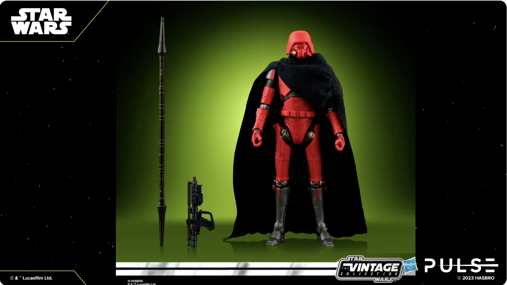 - Accessories include a blaster and soft goods cape