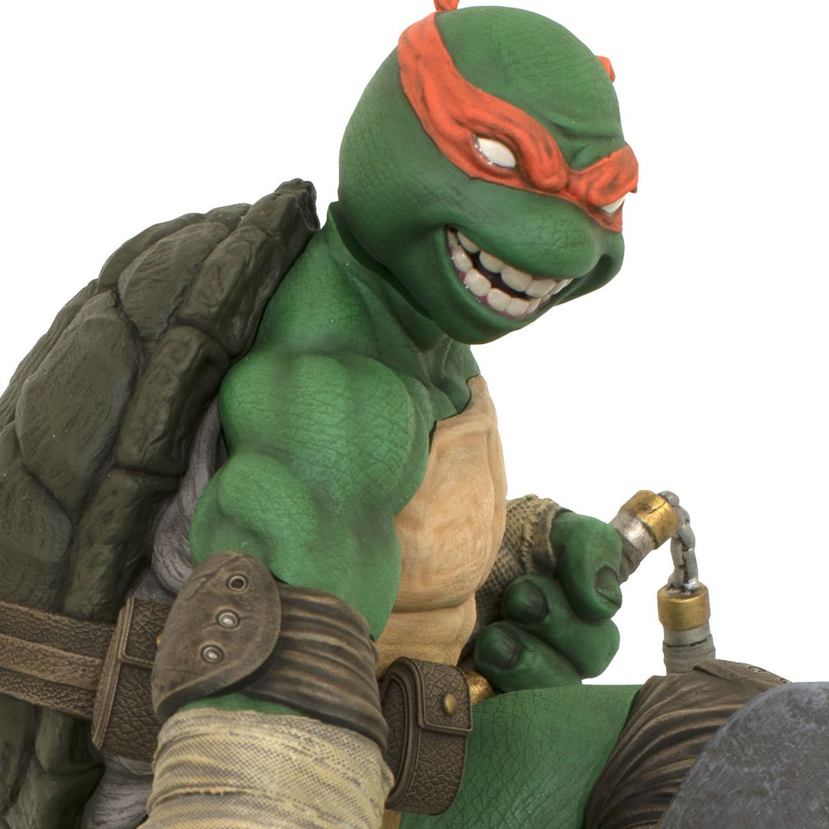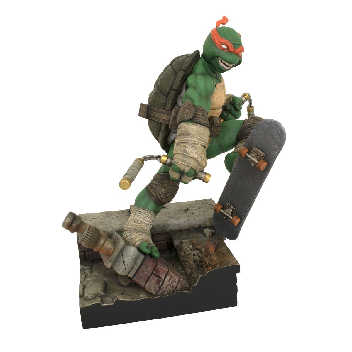 It’s party time! The third turtle to join the Teenage Mutant Ninja Turtles Gallery Diorama line is none other than the party dude himself, Michelangelo! Spinning his nunchuks while doing a trick on his skateboard, Michelangelo stands approximately 9-inches tall and features detailed sculpting and paint applications. Collect all four turtles atop their rooftop bases to form one radical diorama (sold separately). The Teenage Mutant Ninja Turtles Gallery Michelangelo Statue comes packaged in a full-color window box.