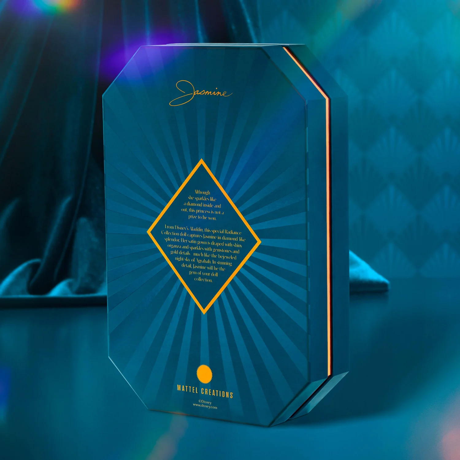 This Princess sparkles like a diamond, inside and out. From Disney’s Aladdin, our Radiance Collection doll captures Jasmine in stunning fashion. Her satin gown is draped with charmeuse and shiny organza and glitters with gemstones and golden details — much like the bejeweled sky that Aladdin and Jasmine soar through on a magic carpet ride. Designed in remarkable detail, Jasmine will be the crown jewel of your doll collection.