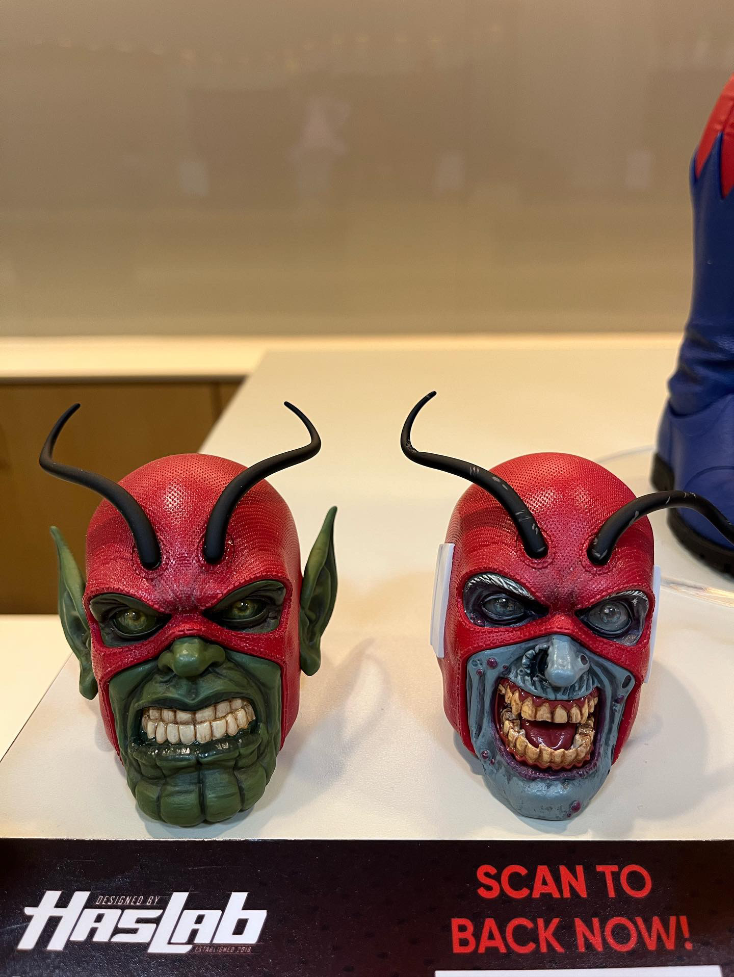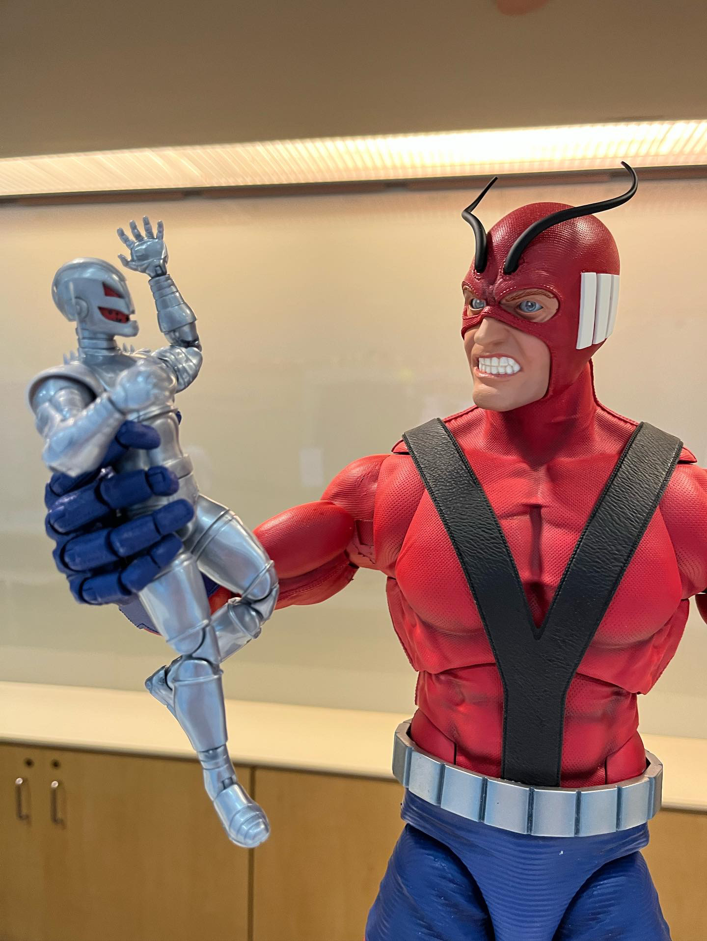 Big thanks to the GDL reader who sent us these pictures of the new Marvel Legends Giant-Man HasLab figure at this year’s D23 as well as the two alternate heads for the stretch goals (Marvel Zombies Faceplate and Secret Invasion Skrull Head). Check out the pictures below of Giant-Man gripping Ultron.