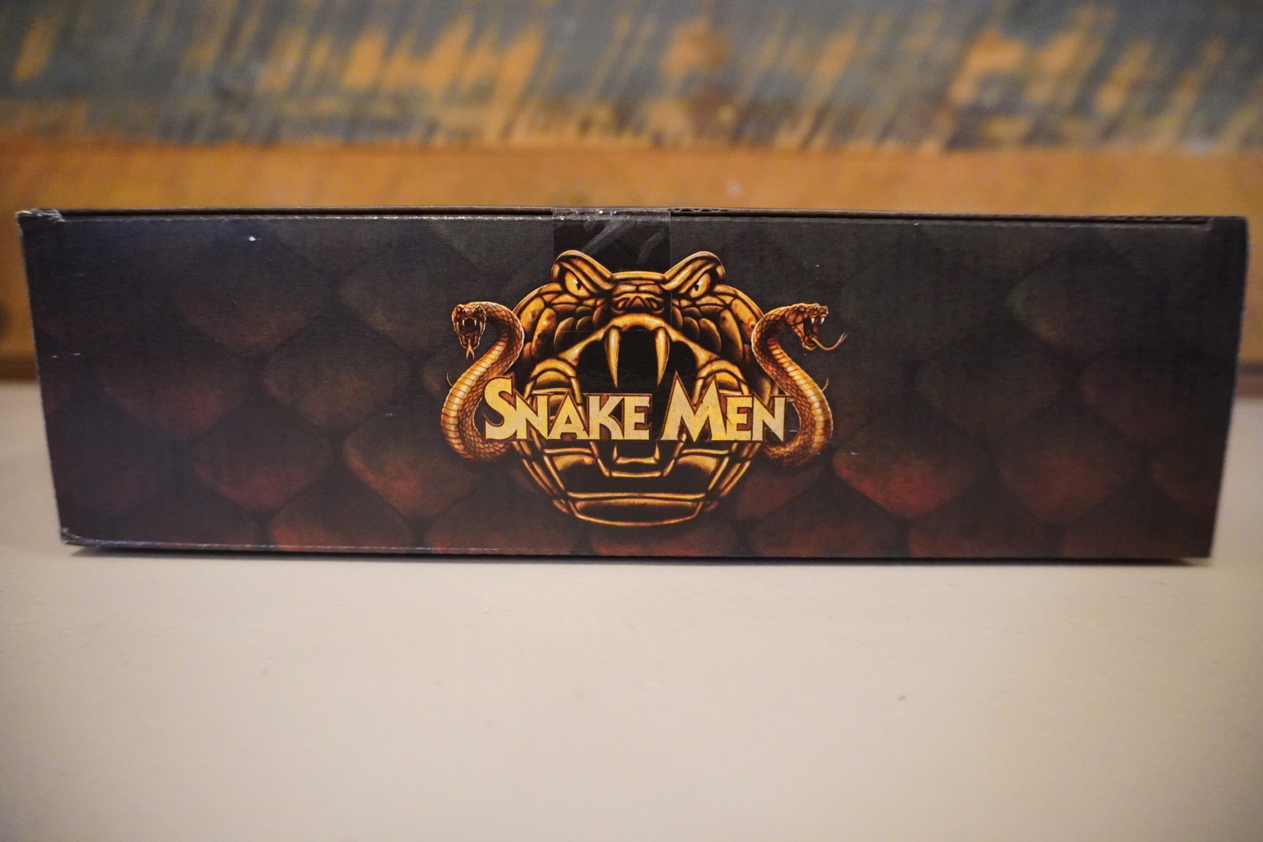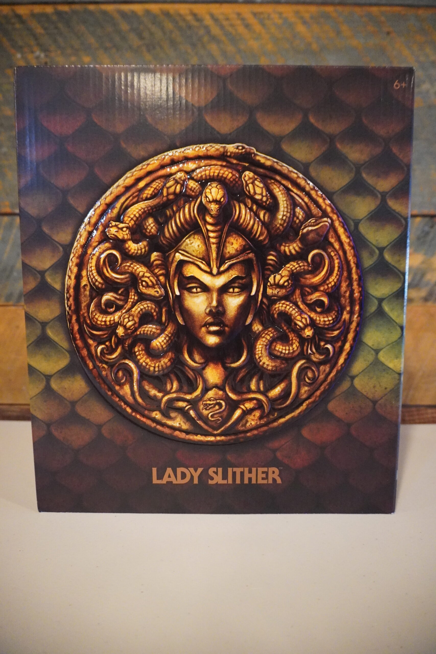 Here’s the packaging. It has a really cool Medusa/snake-themed boxed set with an embossed brass or gold-coined relief of Lady Slither with all of the snakes surrounding her head. The bio for Lady Slither is on the back of the box. As for the actual packaging of the figure itself, the card-back features a full-color large canvas picture of Lady Slither on her throne with her humanoid feet with the same two characters that were on the back of the Wal-mart exclusive Moss Man.
