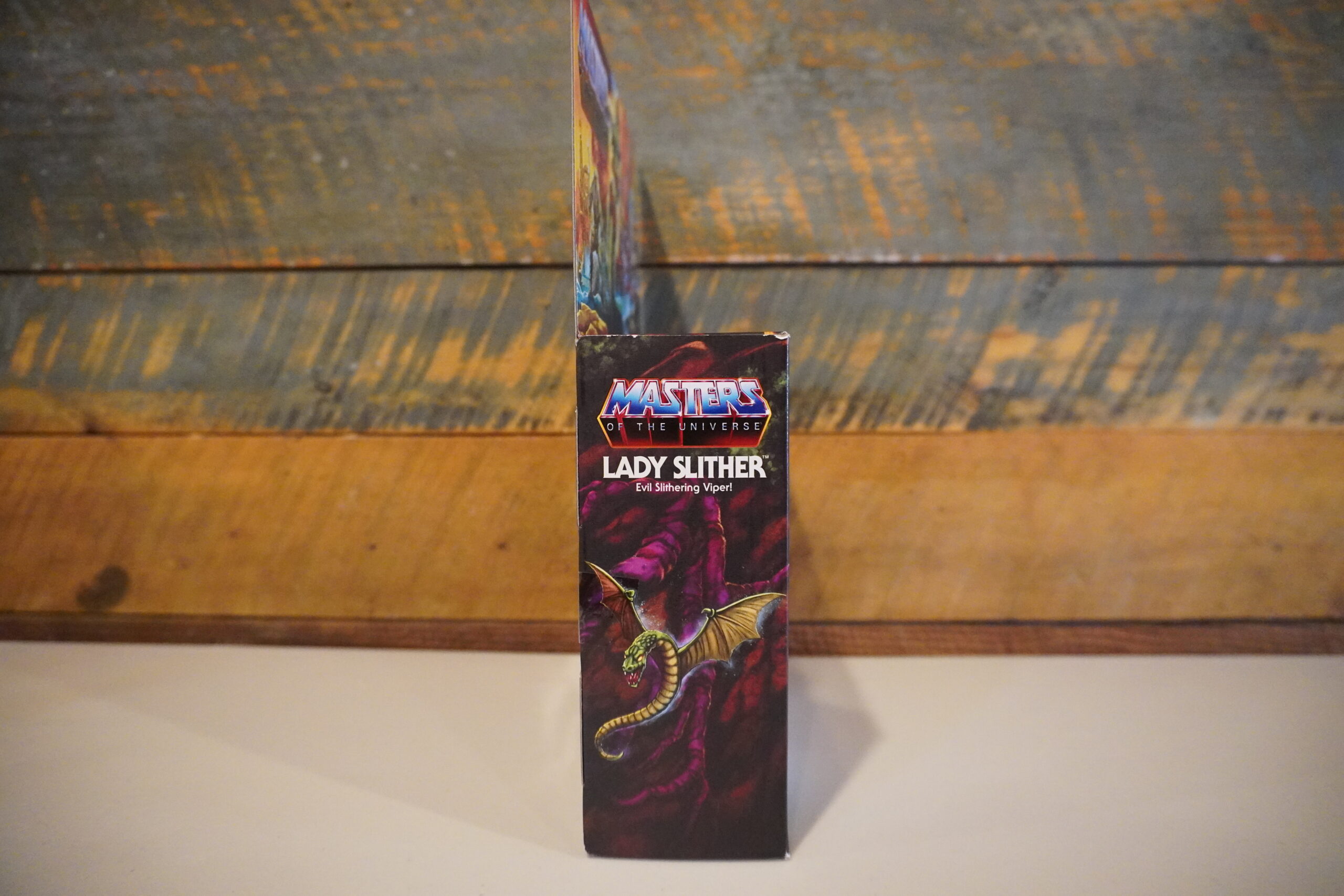 On the front of the box, there are new characters that we haven’t seen in the Origins line yet: Vypor, Stretch Nek, and Reptilax, as well as Fangor and Lady Slither’s lair in the background.