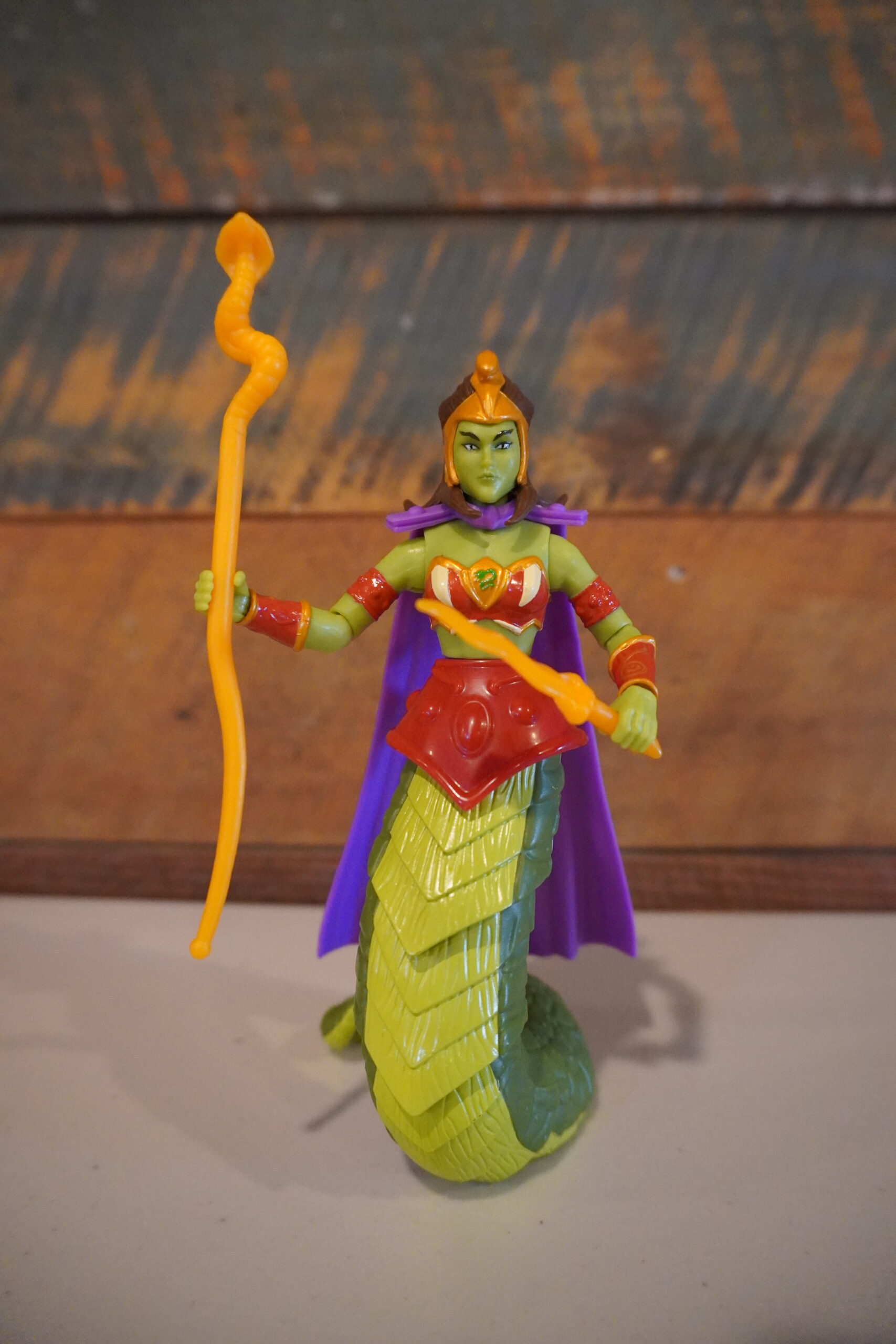 Here’s pictures of Lady S. As you can see, you can swap out her bottom half to show her in serpent or humanoid form. The lower half of the humanoid form is pretty much loooks like Teela-repaint. She comes with the more modern knees but it’s otherwise pretty plain. The upper half has a lot of paint detail, with nice gold highlights on her cuff-lets, chest hair, and head dress. Her cape is that rubbery material that we’ve seen on other MOTU figures. Her snake staff is the same one as Teela – could there be a direct connection there? She also comes with a gold Sword of the Serpent accessory.