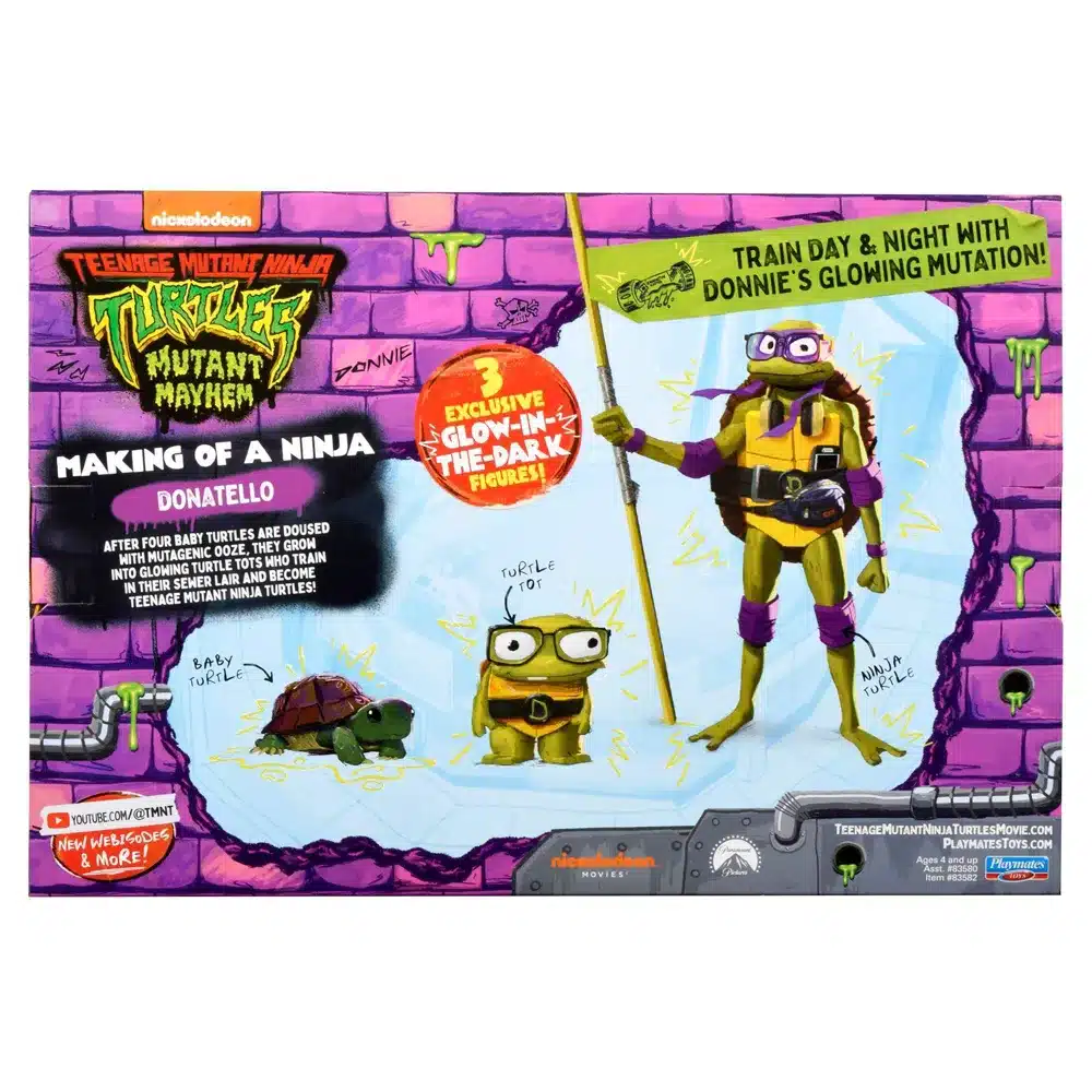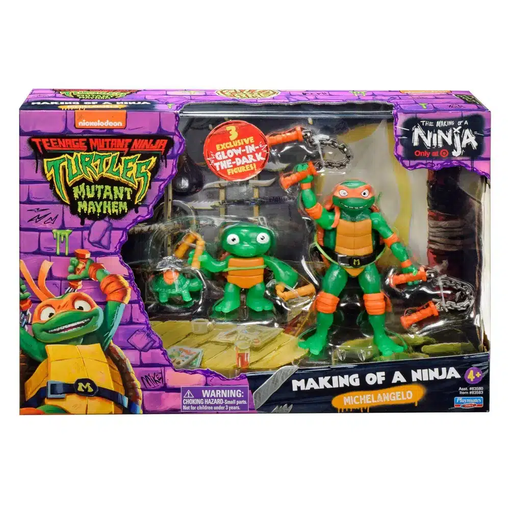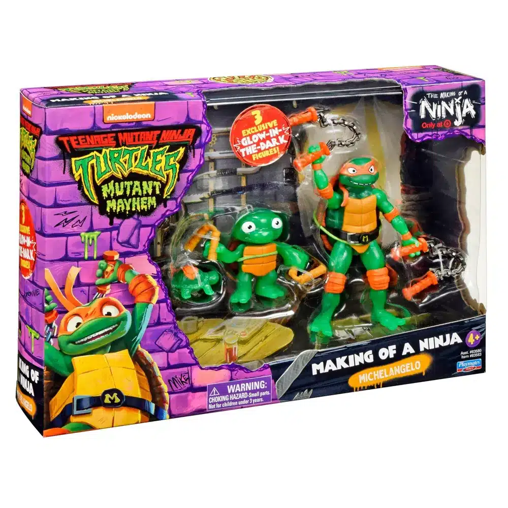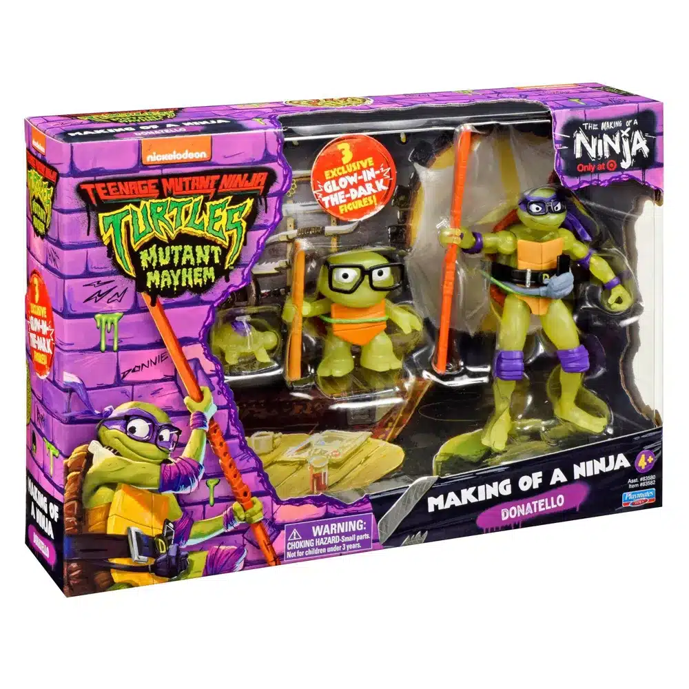 The Teenage Mutant Ninja Turtles: Mutant Mayhem Making of a Ninja Michelangelo and Donatello from Playmates Toys are now available as a Target Exclusive. Each set is $14.99 and comes with a baby, child, and teenage-size of the turtle. They also glow in the dark! Check out pictures and individual links below.