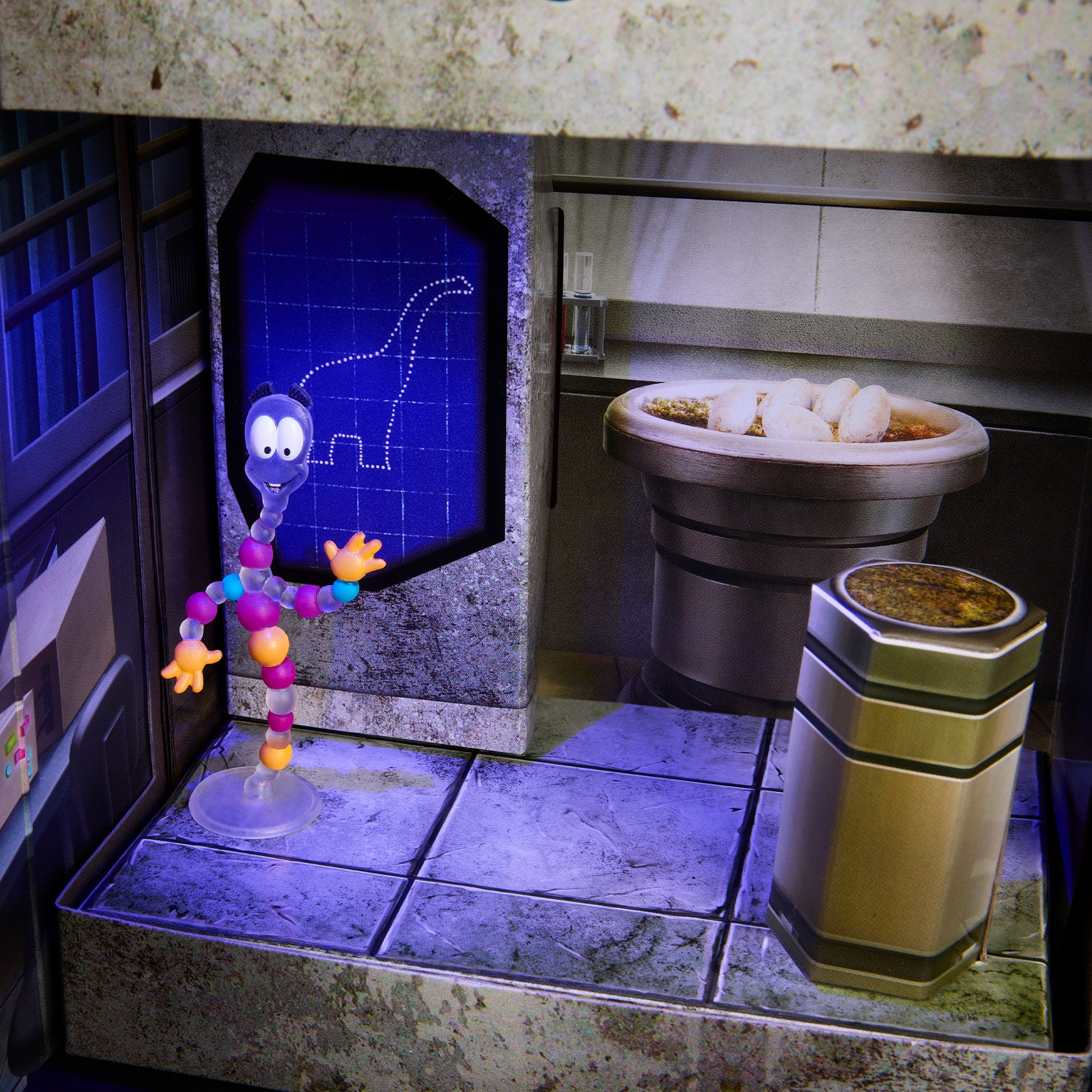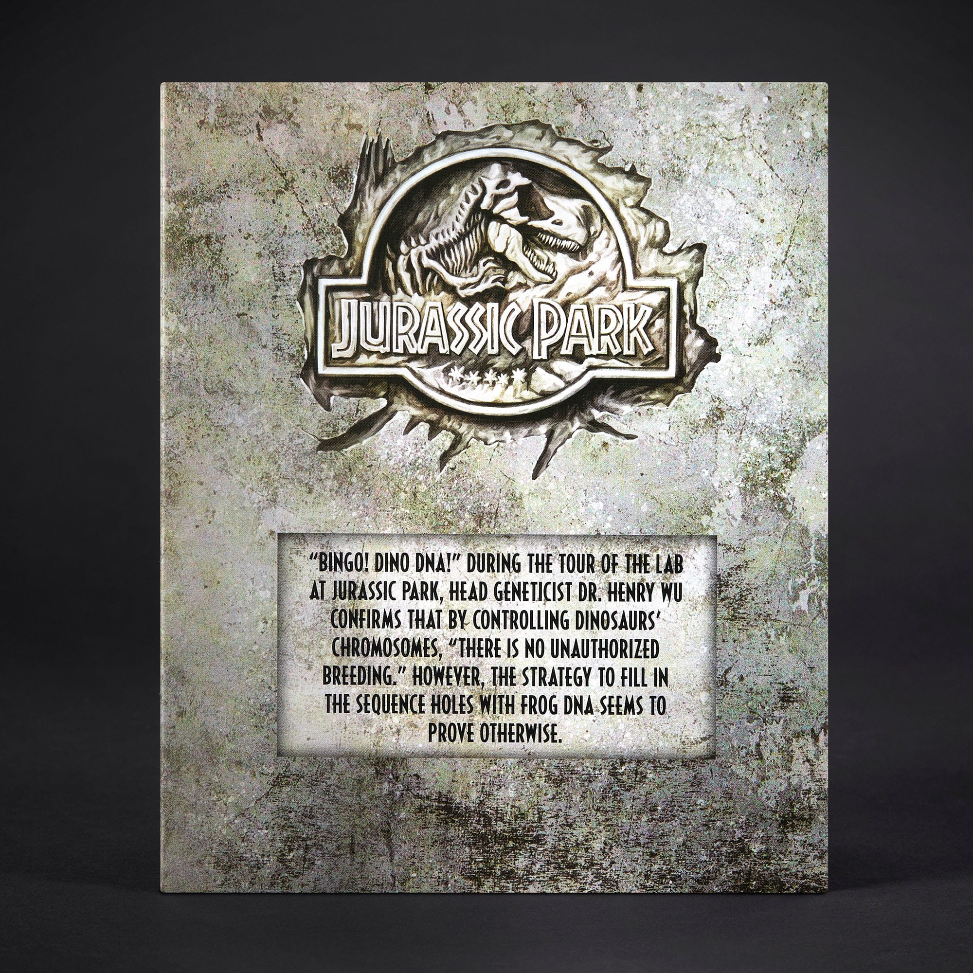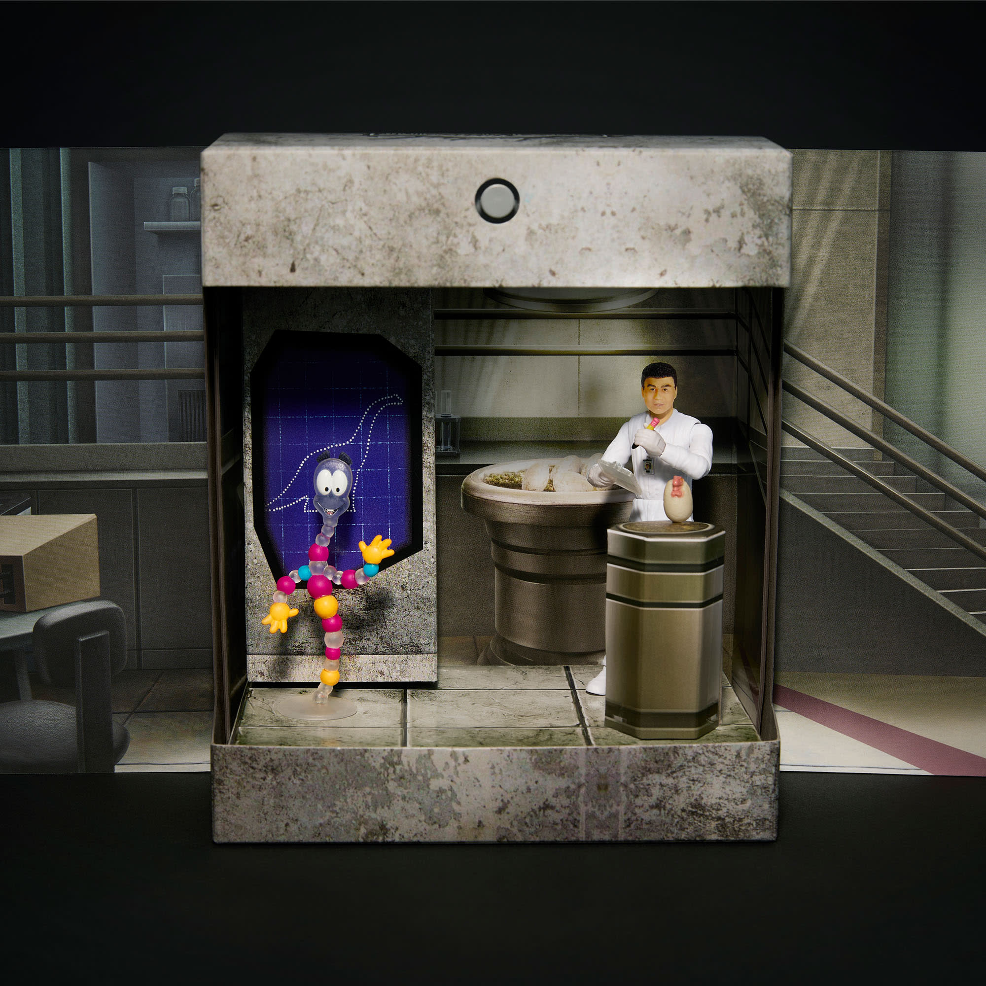 The journey opens in the unboxing. Breach the security system doors to enter the lab, where lights flicker ominously. The packaging includes film details, an egg incubator, and other testing equipment. There are even sounds, as Dr. Wu and Mr. DNA have 4 button-activated phrases triggered through a button on the packaging.