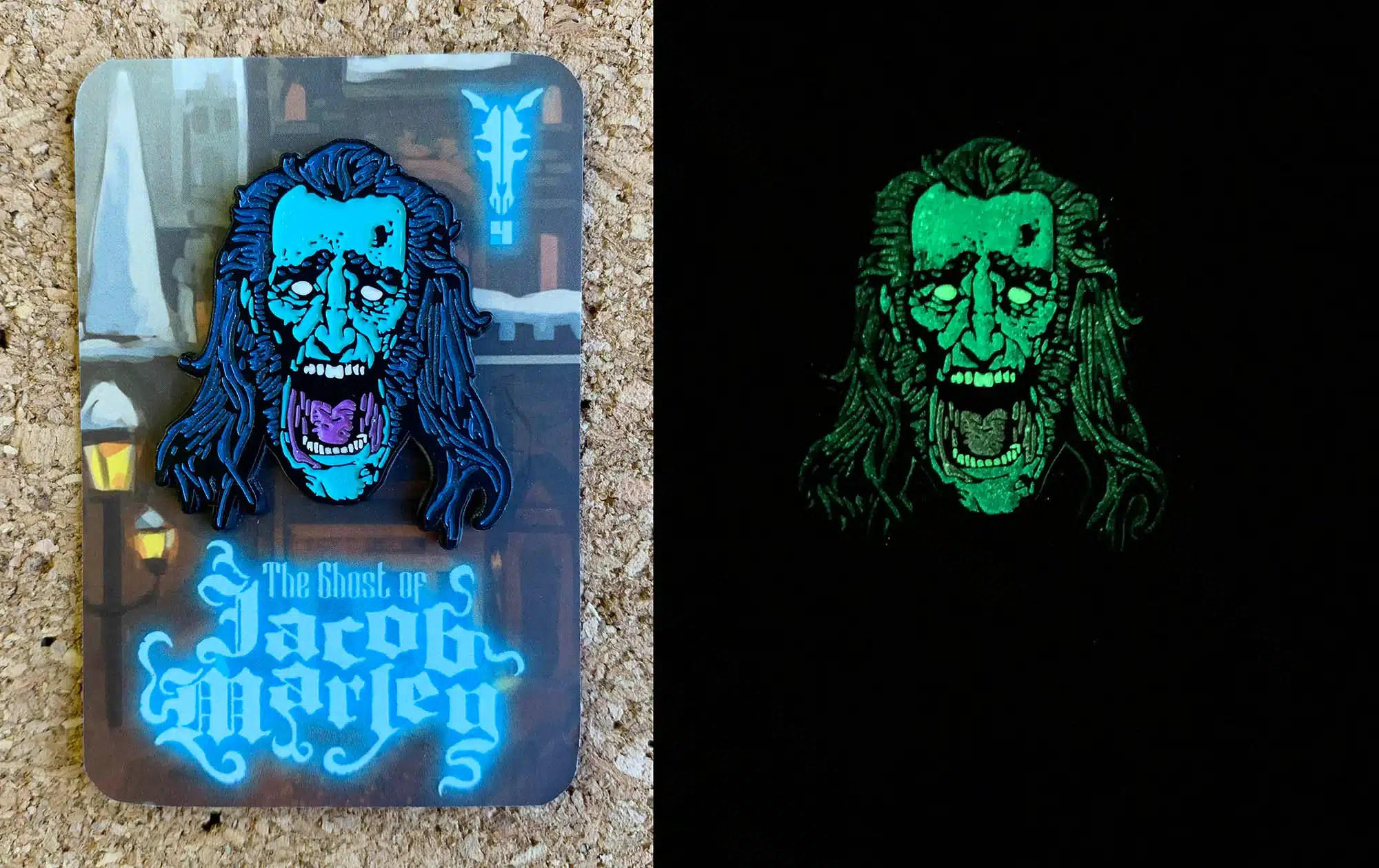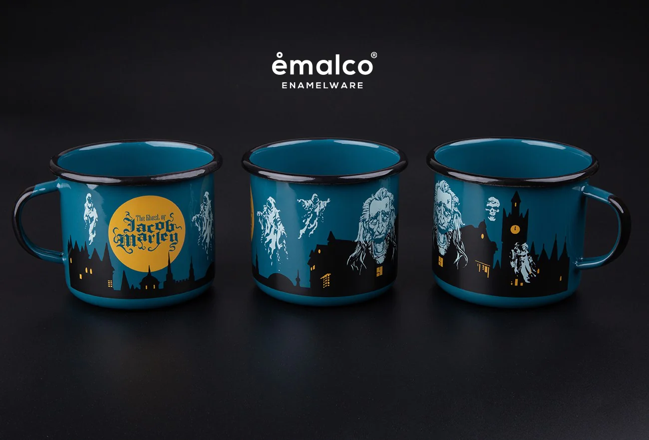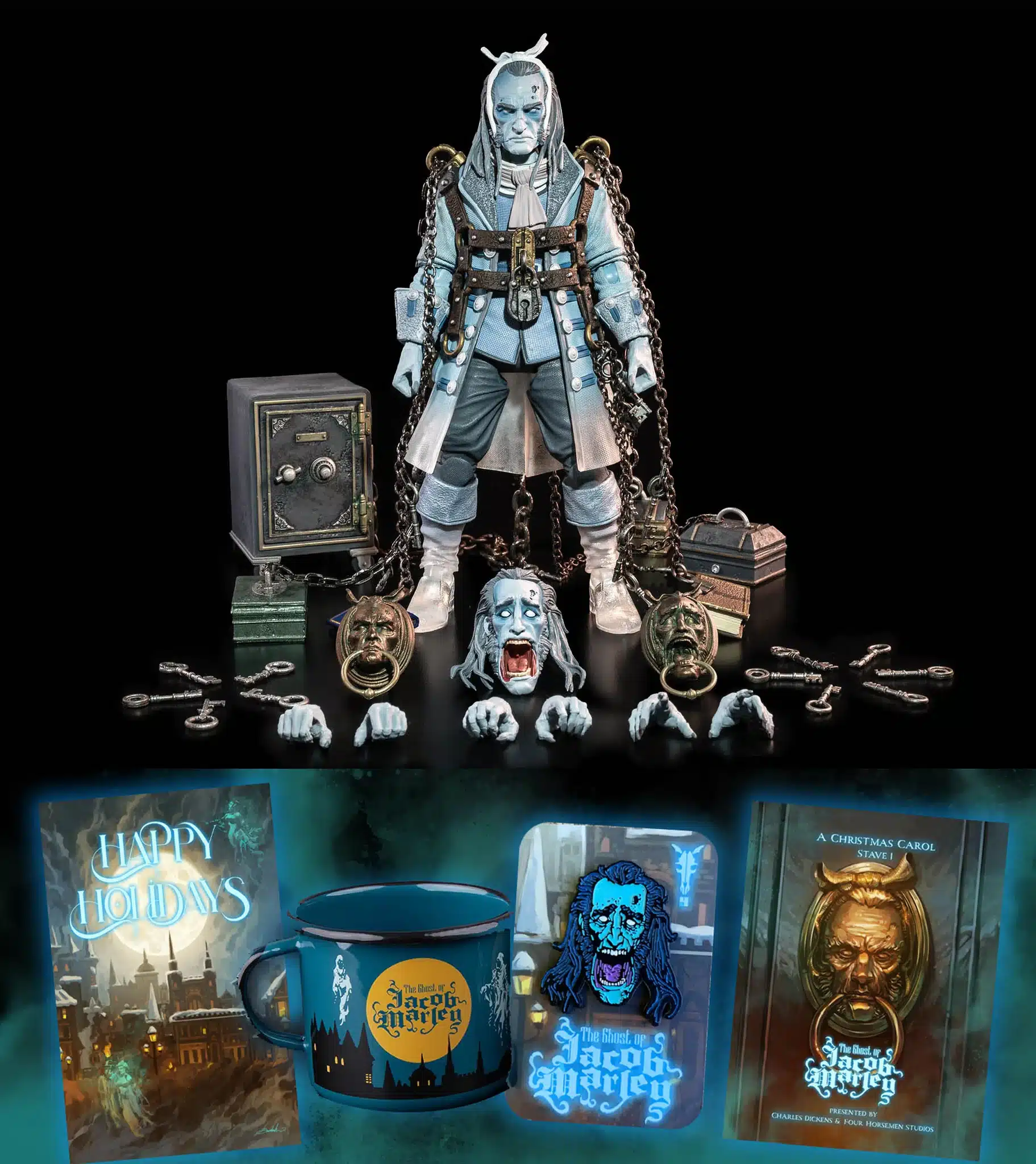 Figura Obscura: ALL IN – The Ghost of Jacob Marley; $95; In addition to the Jacob Marley figure, this ALL IN set also includes 1 soft enamel Jacob Marley pin (it glows in the dark!), 1 handcrafted European metal enamelware mug imported from Poland, and a 10-pack of holiday greeting cards.