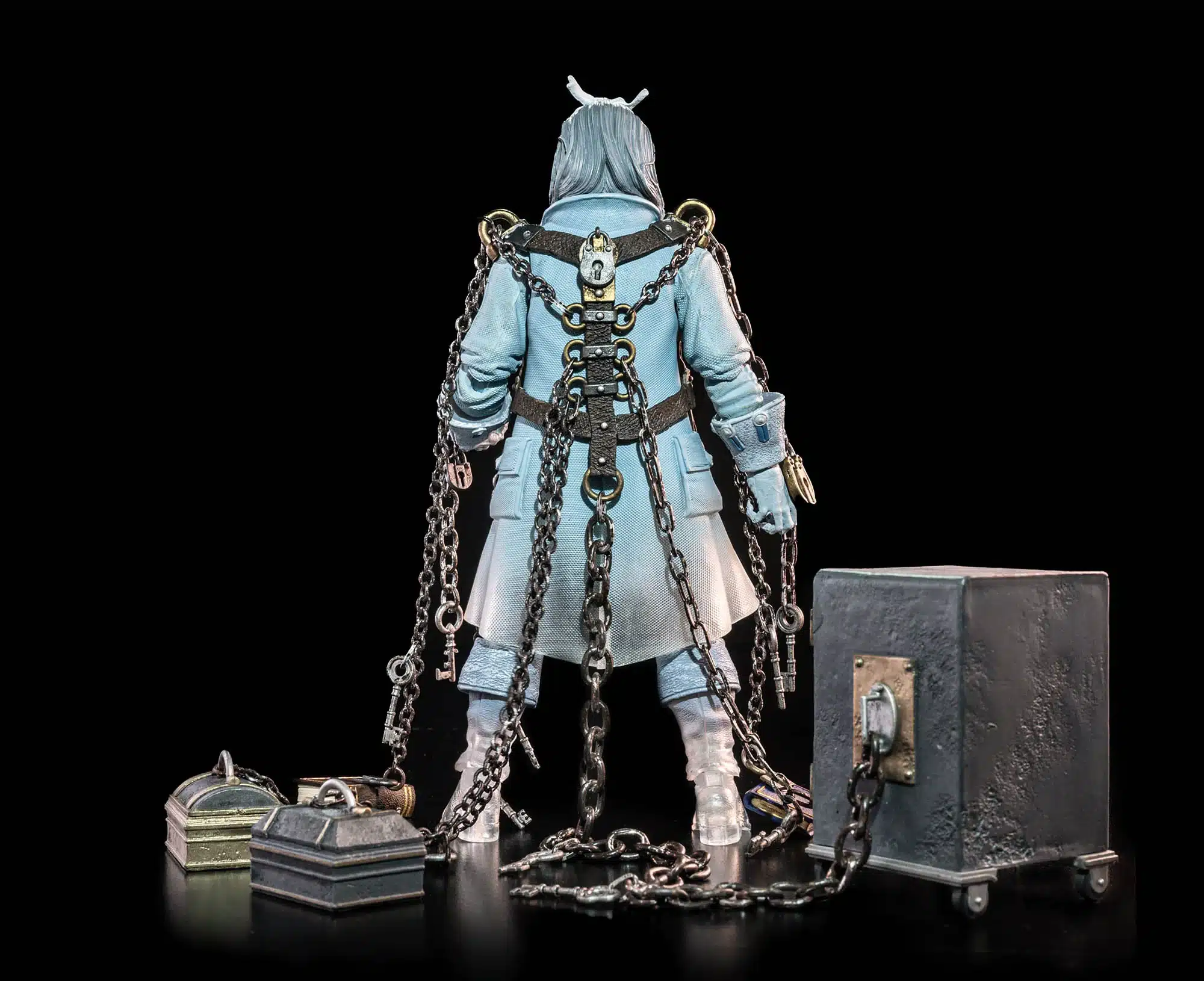 Figura Obscura: The Ghost of Jacob Marley $60; This 1:12 (approx 7-inches), highly articulated “GHOST OF JACOB MARLEY” deluxe action figure will come in a 4-color window box package with removable background display cover, and character-specific packaging details and accessories.. Final paints and certain details on the final product may vary slightly from the prototype images shown. All figures also include an illustrated mini-comic featuring the first chapter of Charles Dickens’ “A Christmas Carol”, which is where this character comes from.