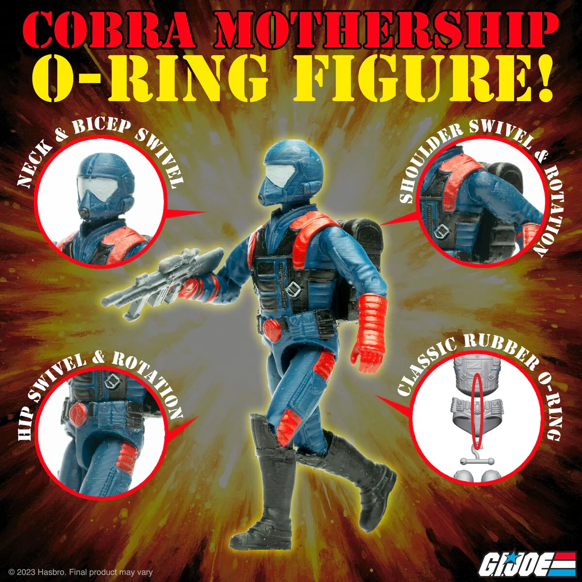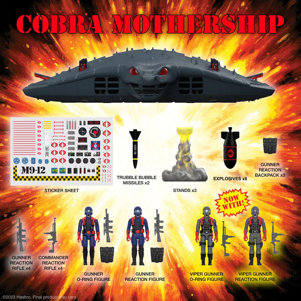 Custom built to scale with 3.75” ReAction Figures and vintage G.I. Joe O-Ring Figures, the Cobra Mothership is a massive 31” in diameter, has numerous awesome defense details and battery-powered light up engine features, includes an arsenal of accessories, and comes with FOUR exclusive Cobra Viper Gunner figures – two ReAction Figures and two O-Ring Figures!
