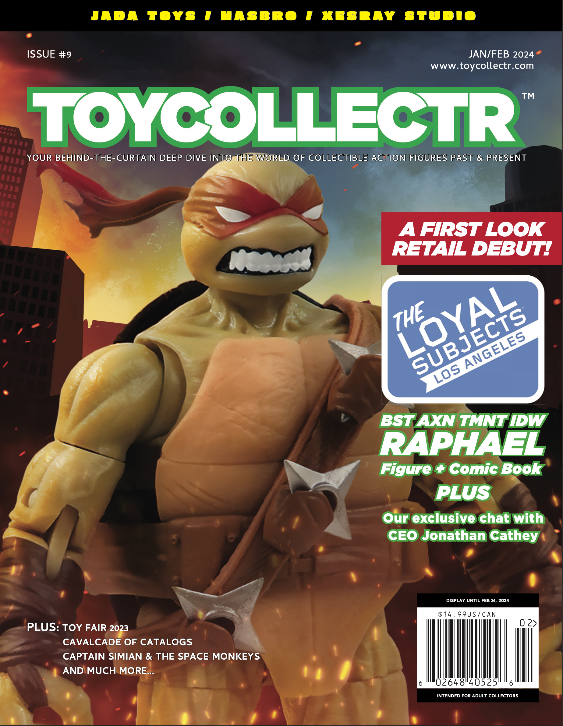Issue 9 of TOYCOLLECTR magazine ships next week. The cover, which was shared via Twitter/X, reveals an exclusive interview with The Loyal Subjects CEO Jonathan Cathey and a first look at the new BST AXN IDW Raphael Figure and Comic, drawn by artist Mateus Santolouco. Issue 9 also features a review of Toy Fair 2023, which took place in New York City back in October.