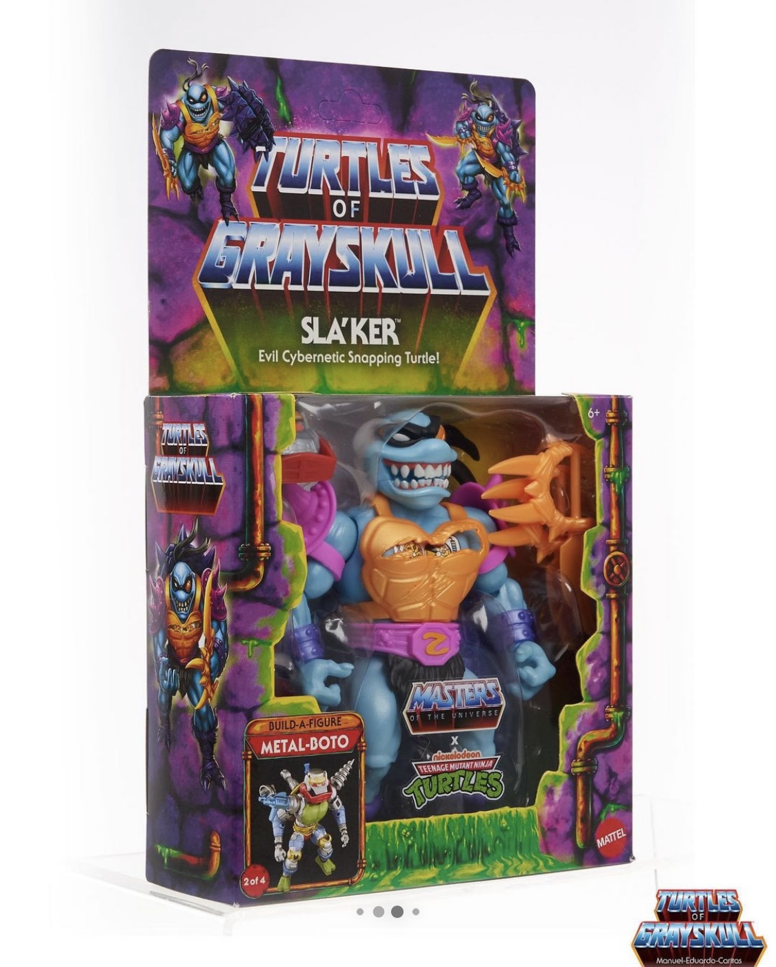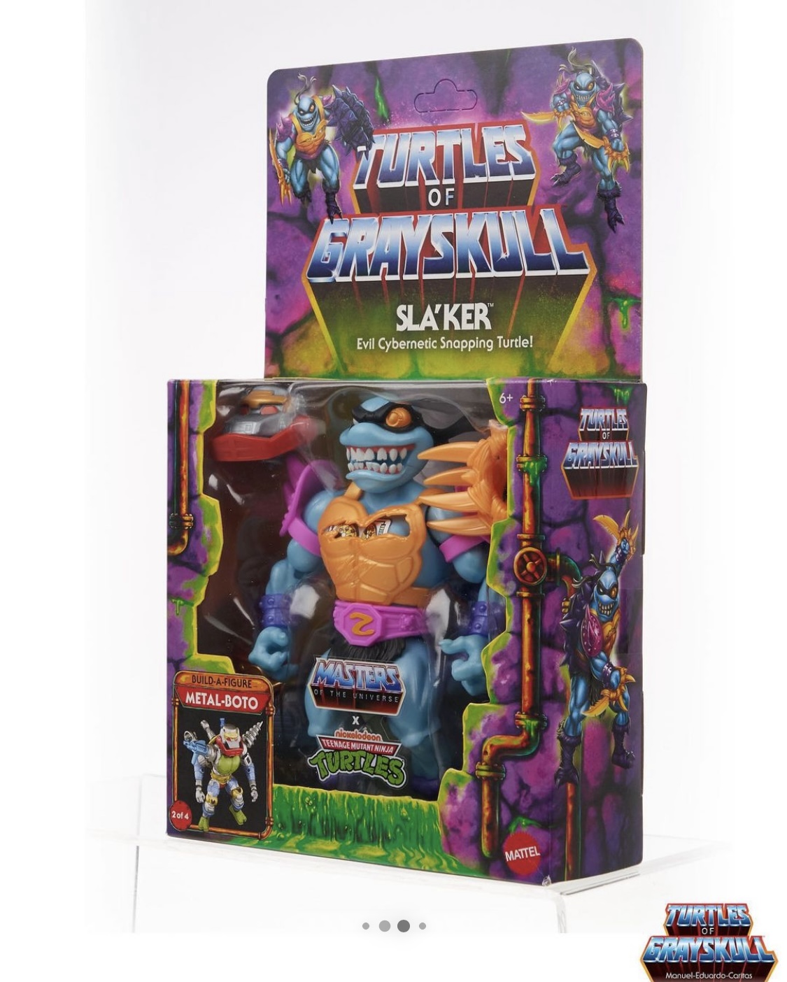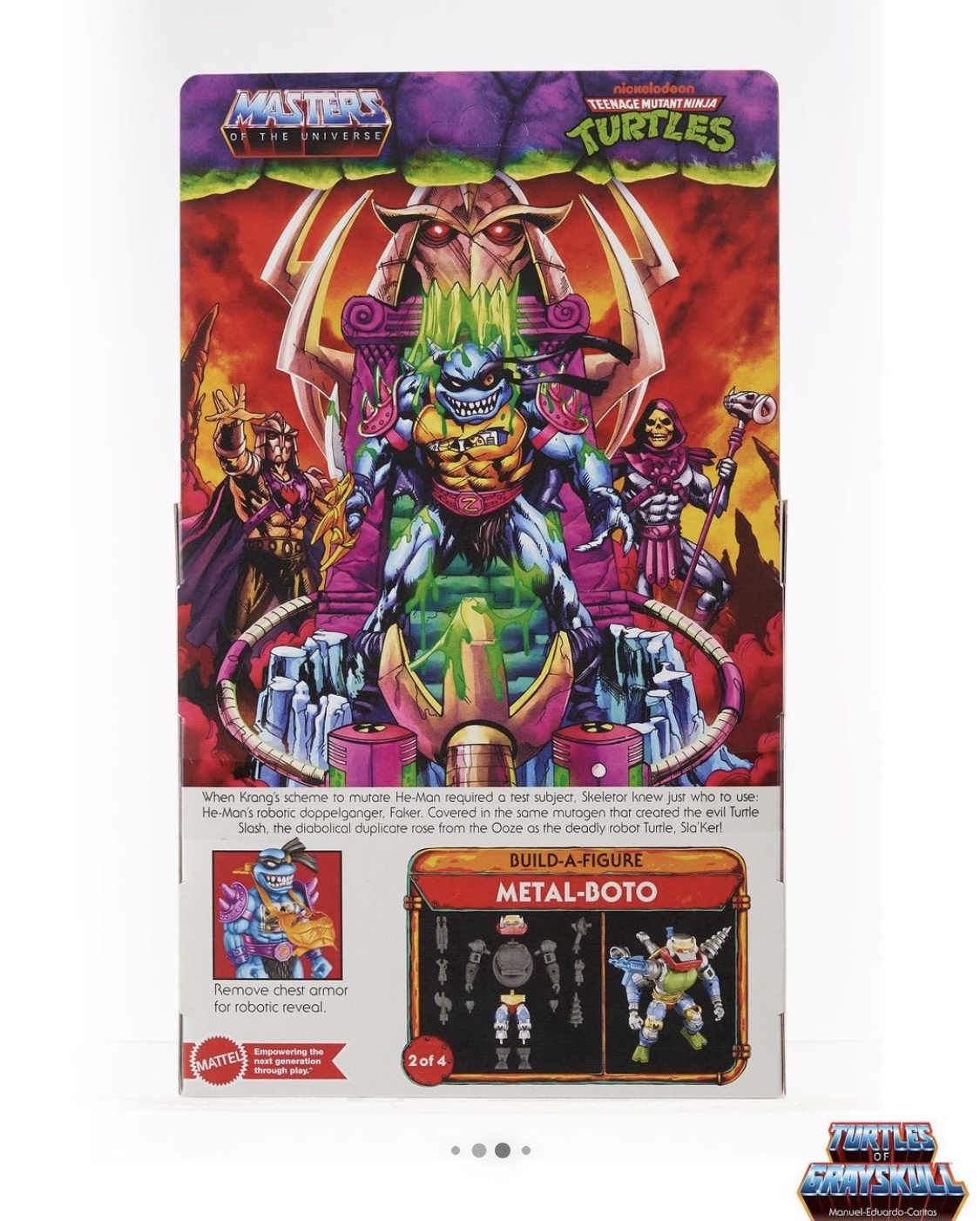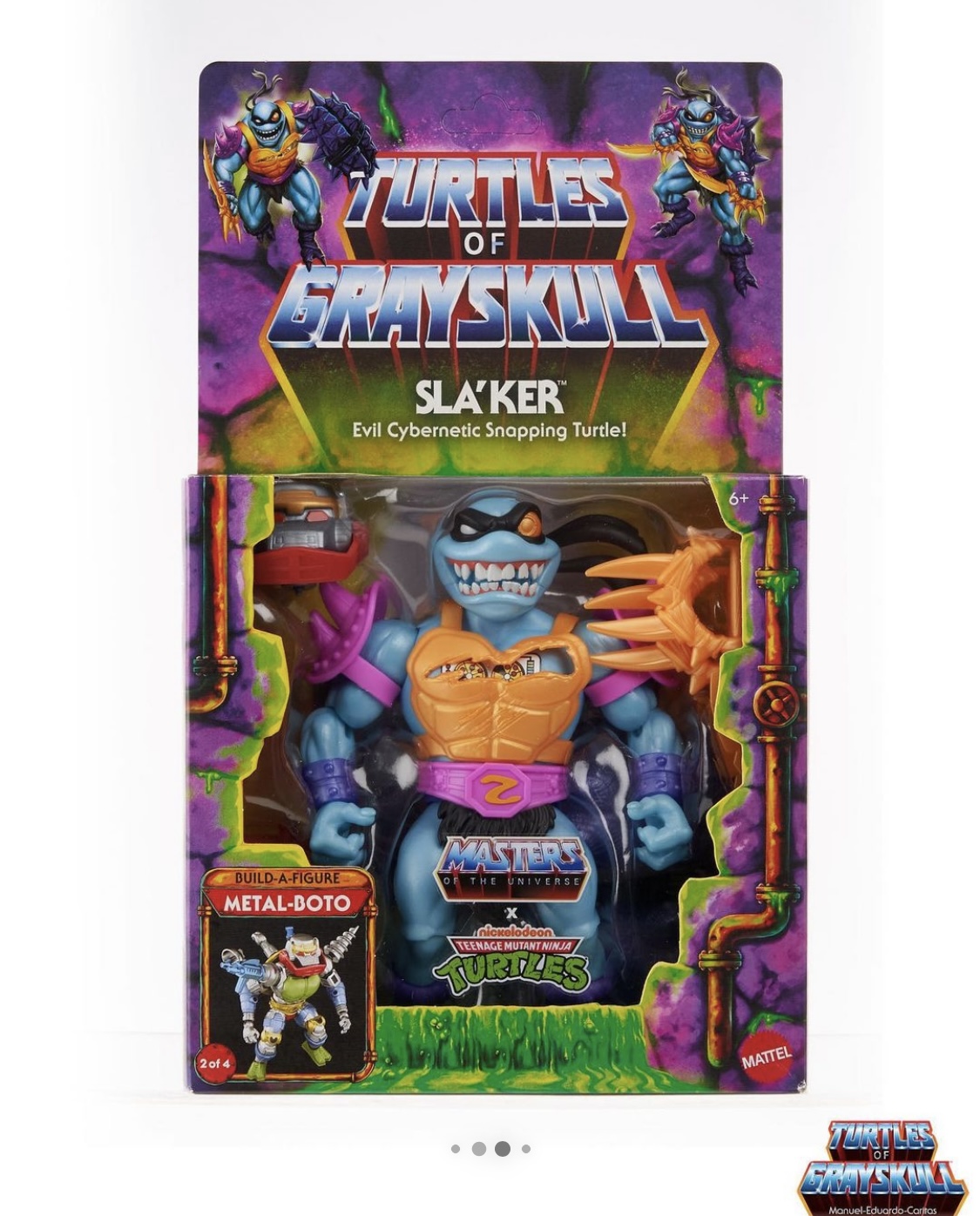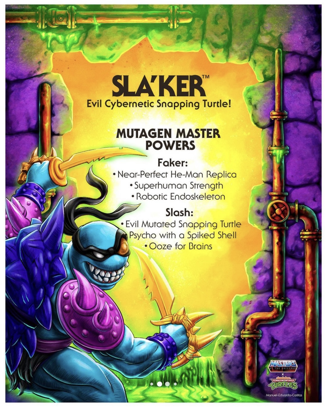 COWABUNGA DUDES! Here’s a closer look at the deadly artwork and packaging for the upcoming Sla’Ker, the evil cybernetic snapping turtle from the #TMNT x #MOTU Turtles of Grayskull collaboration.