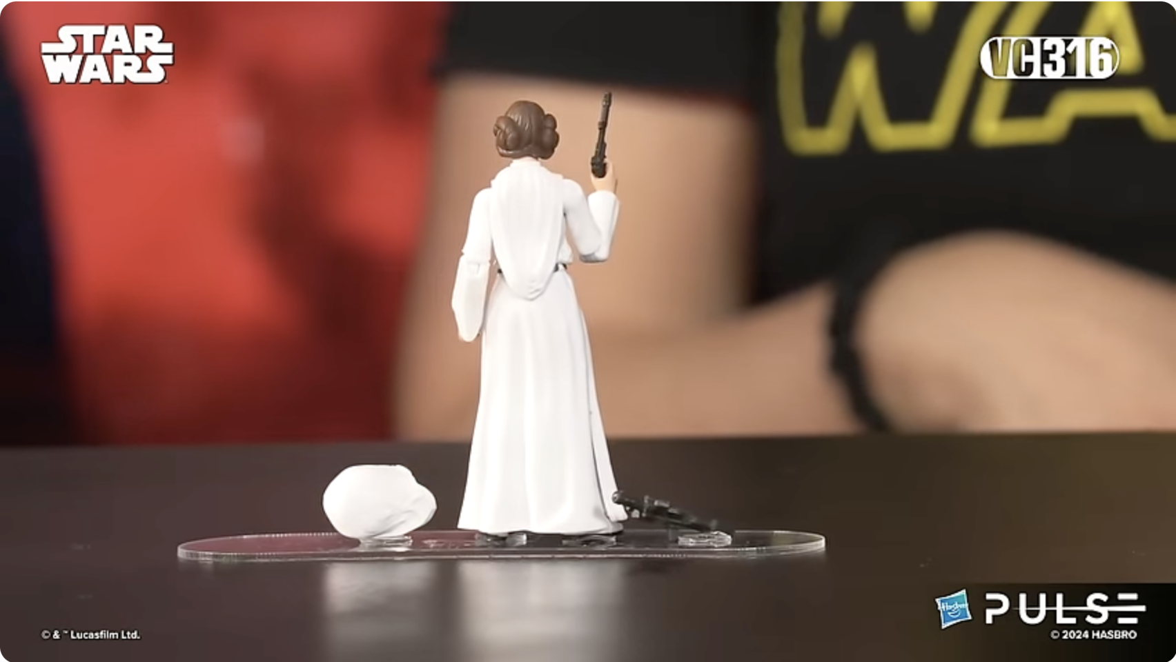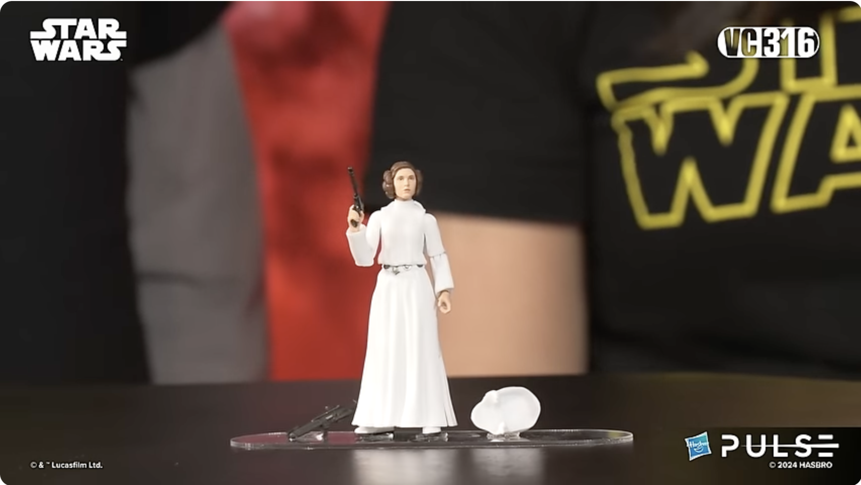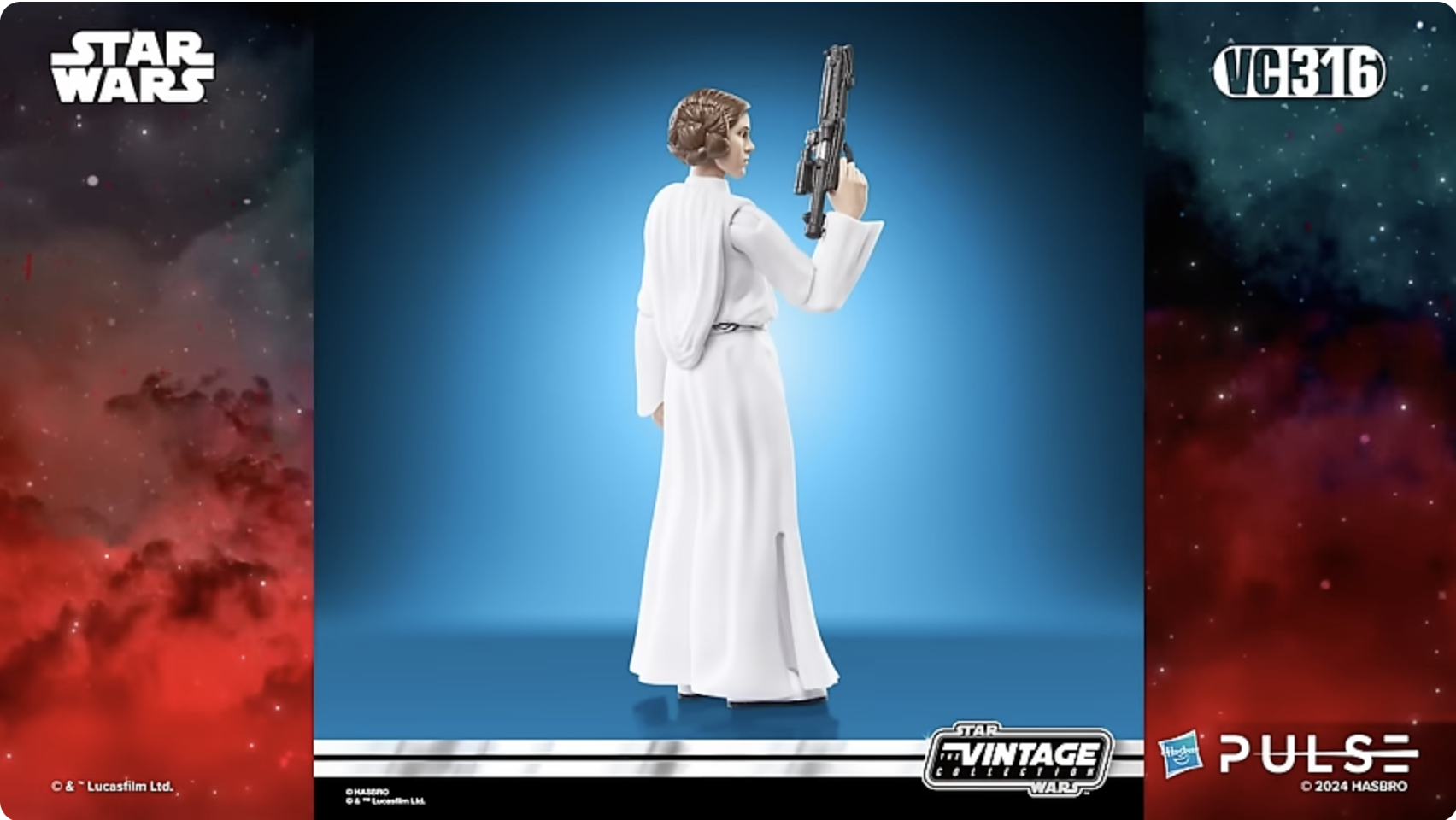 - A New Hope Princess Leia: Featured in her A New Hope outfit (plastic) with hood in two poses. Comes with blaster pixel. Uses original style kenner packaging; VC #316