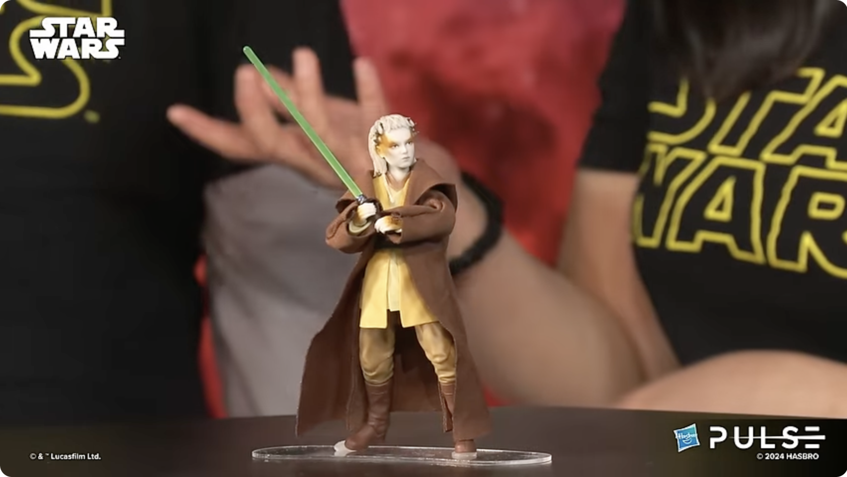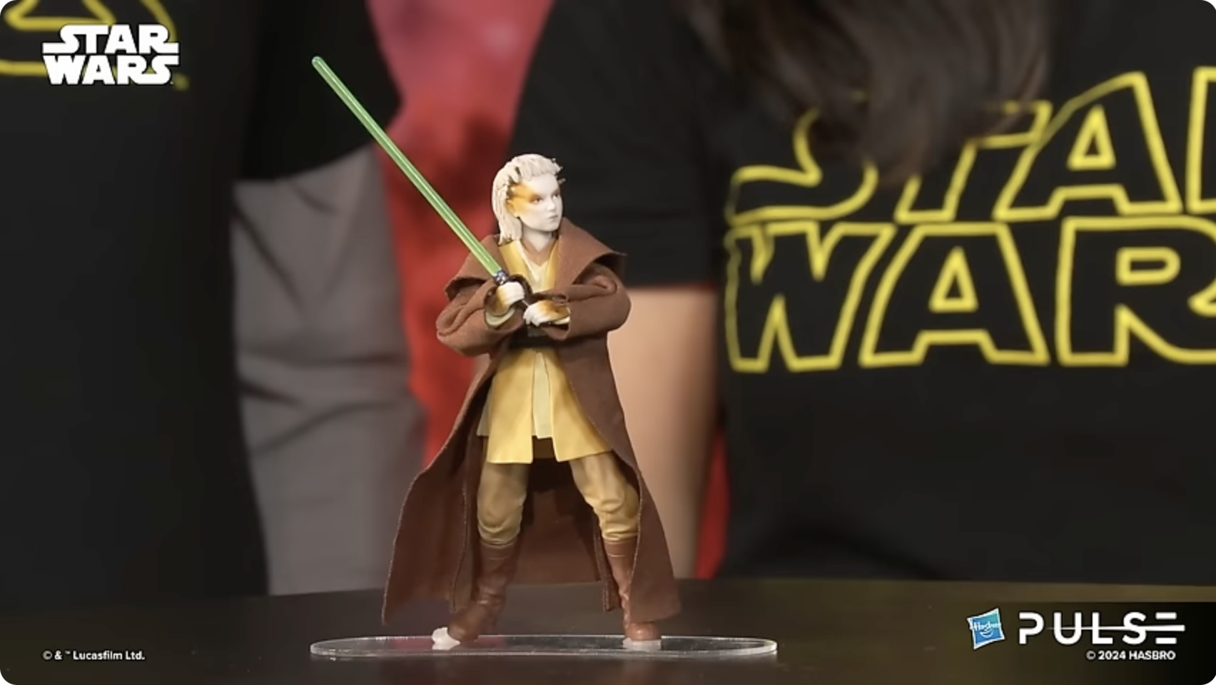 - Padawan Jecki Lon: Fully newly sculpted alien species Jedi; has a green lightsaber; soft goods removable Jedi robe, Details on side of head; window box packaging