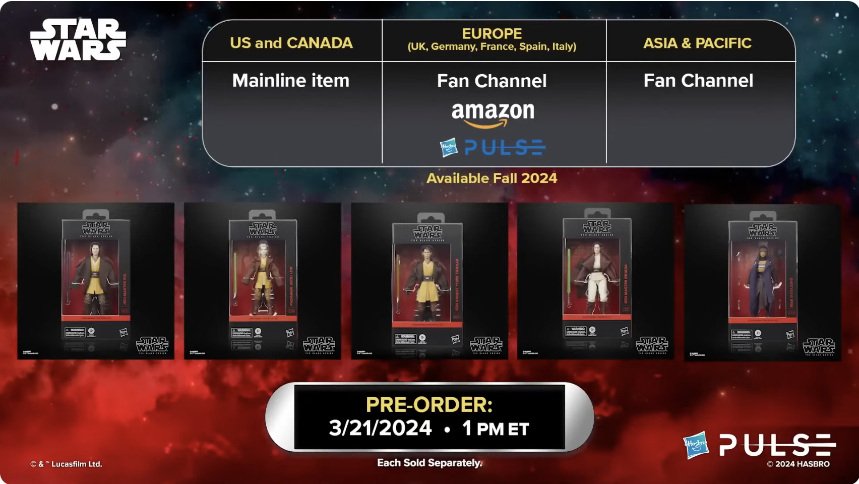 Star Wars The Black Series: The Acolyte Wave 1: All window box packaging that forms a mural using side images; Preorders begin March 21, 1:00 p.m. ET. Mainline US and Canada, Fan channels, Amazon, and Hasbro Pulse in Europe, and Fan Channel Asia