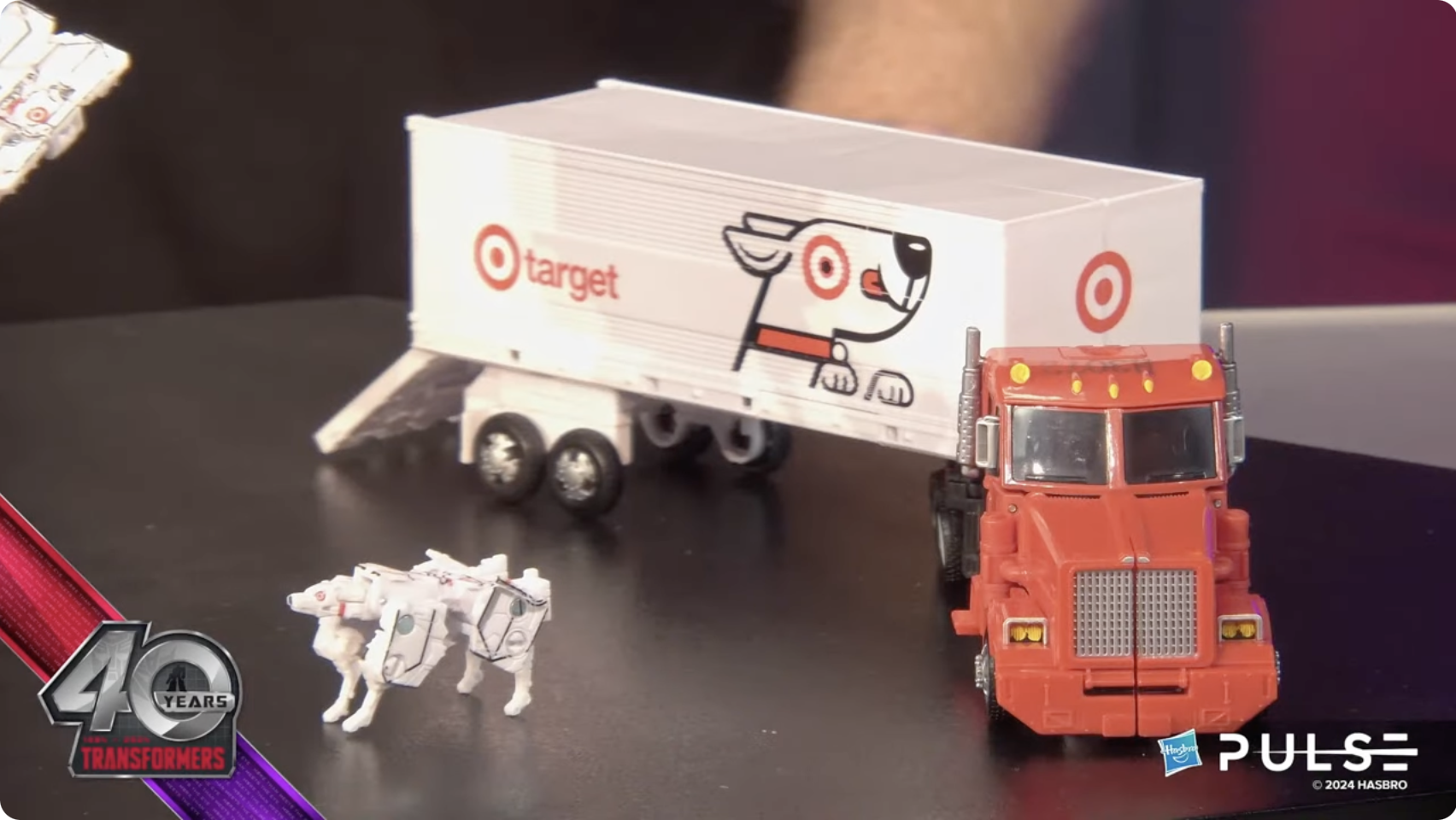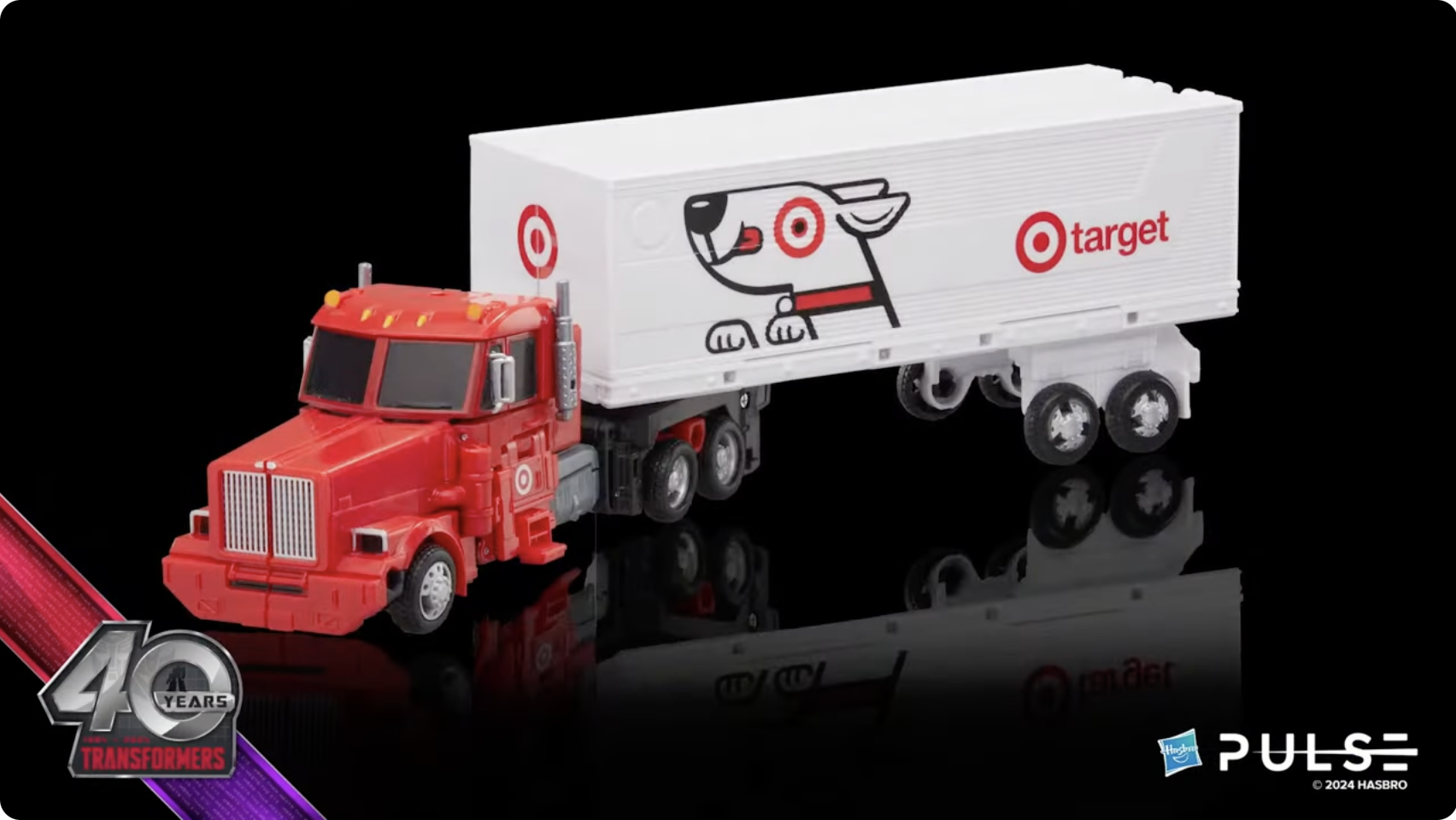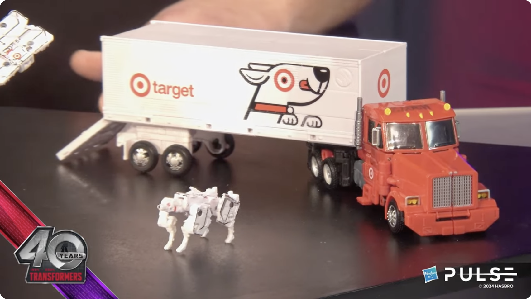 Target Optimus Prime:Â Includes autobot Bullseye the dog (Target mascot); From laser mold; Wearing a Target scanner on his chest; Transforms into a Target truck. [$60; June 23, 2024 release]