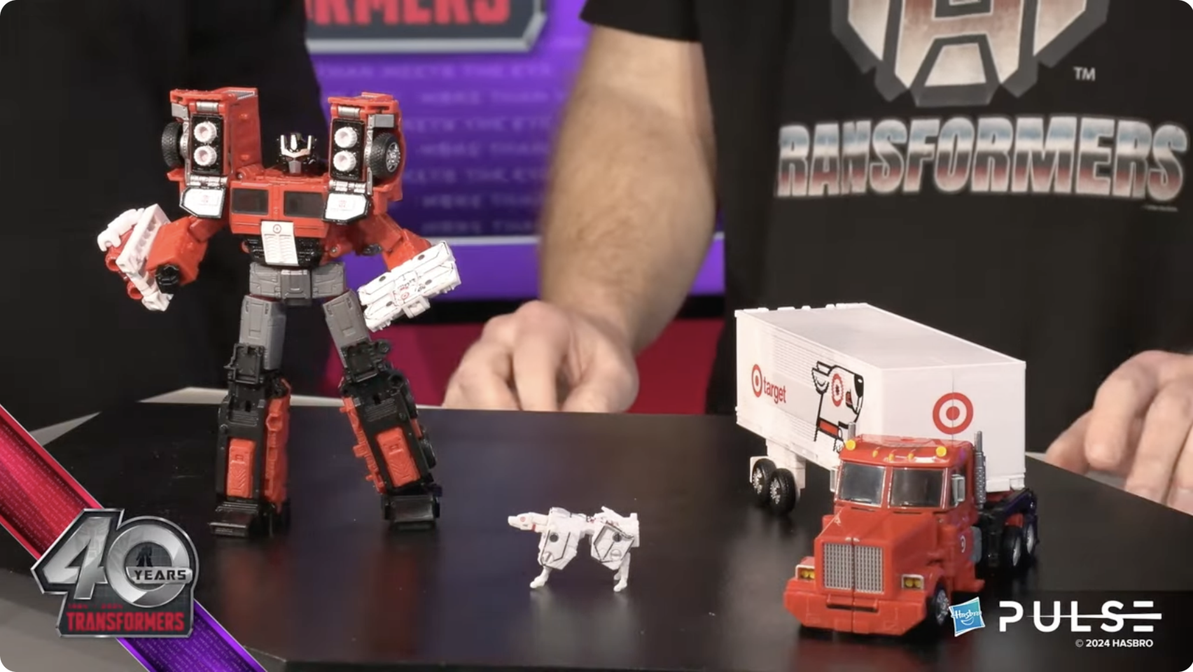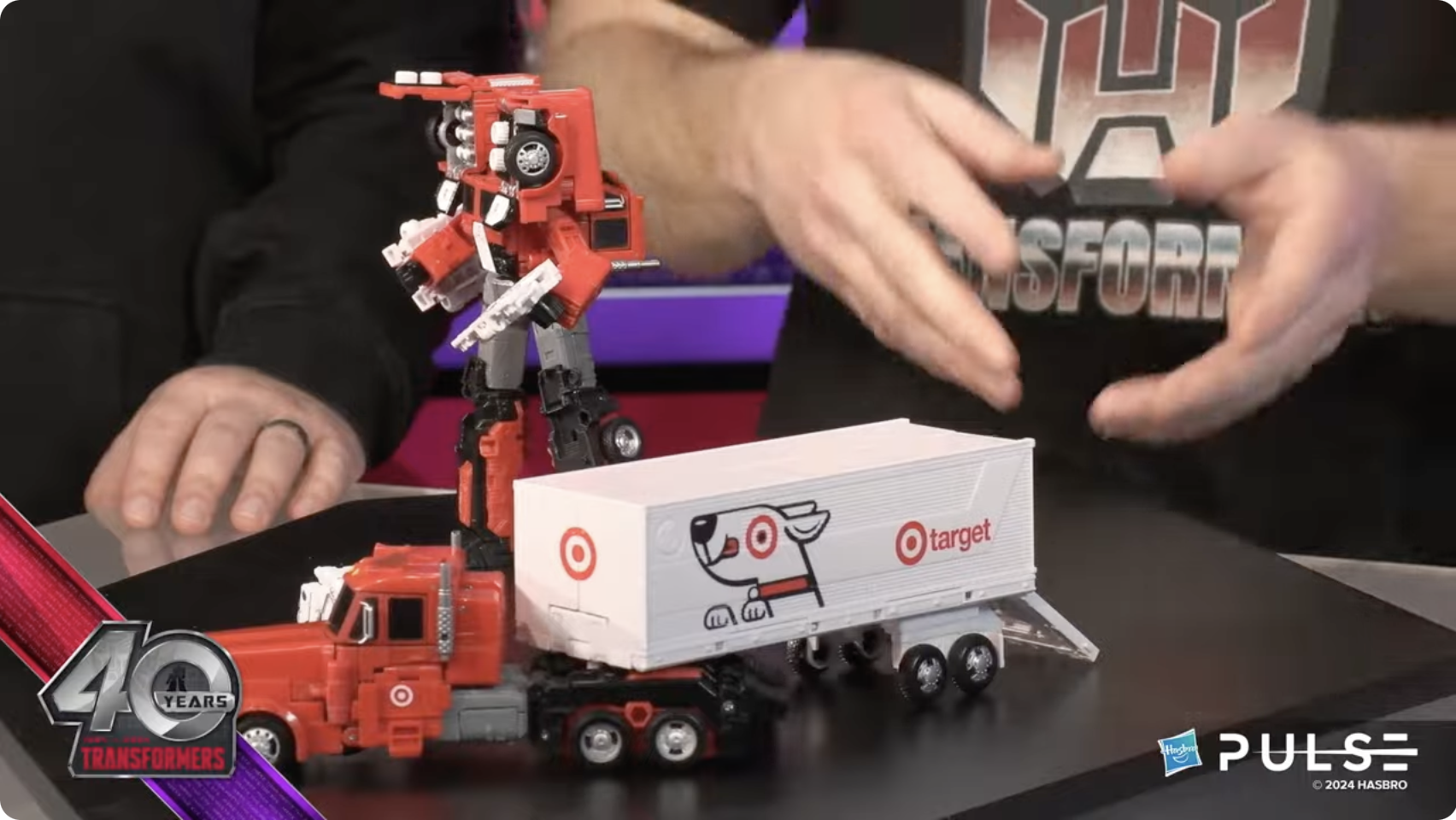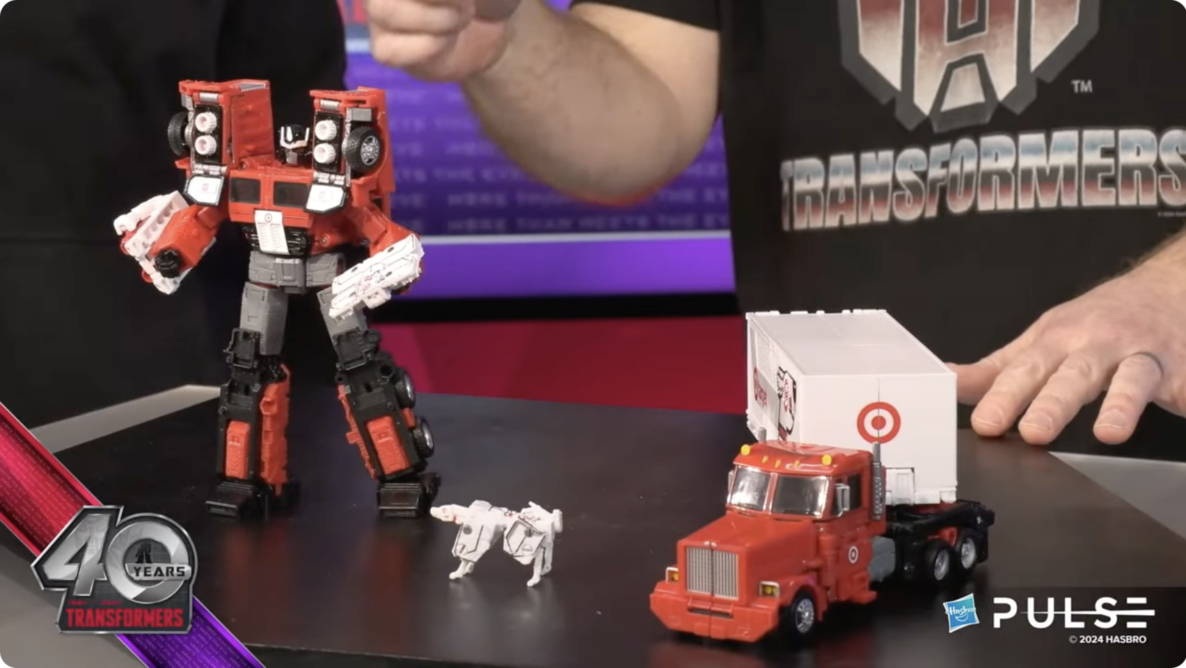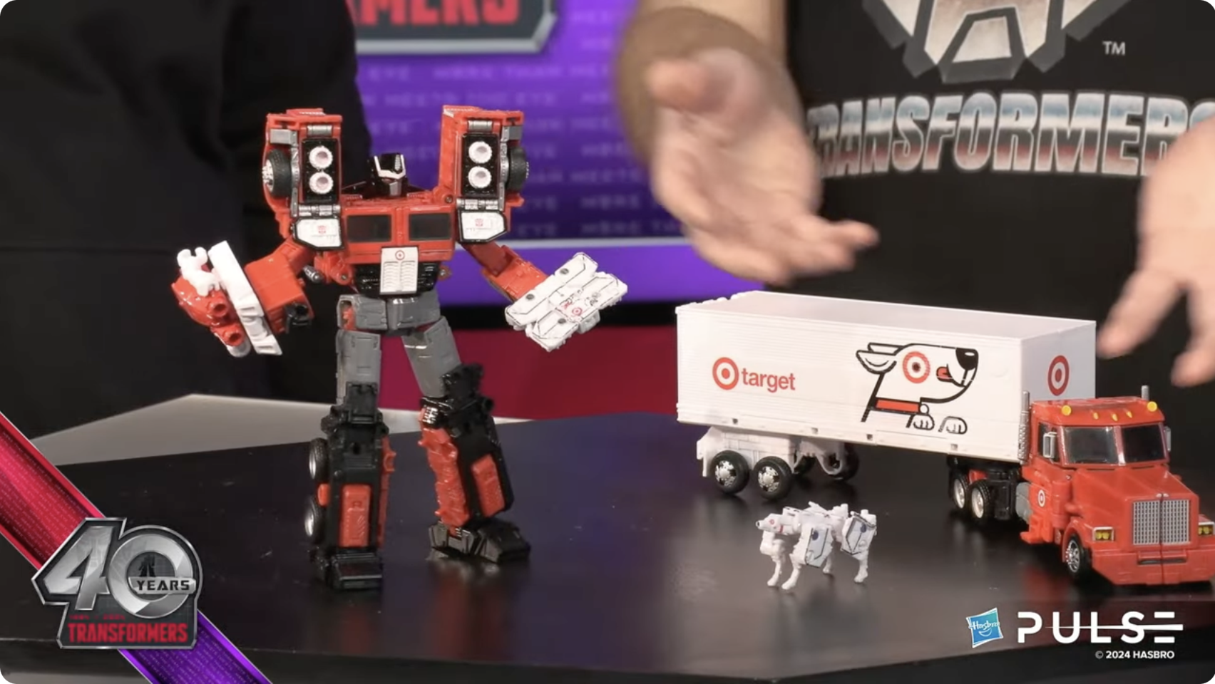 Target Optimus Prime:Â Includes autobot Bullseye the dog (Target mascot); From laser mold; Wearing a Target scanner on his chest; Transforms into a Target truck. [$60; June 23, 2024 release]