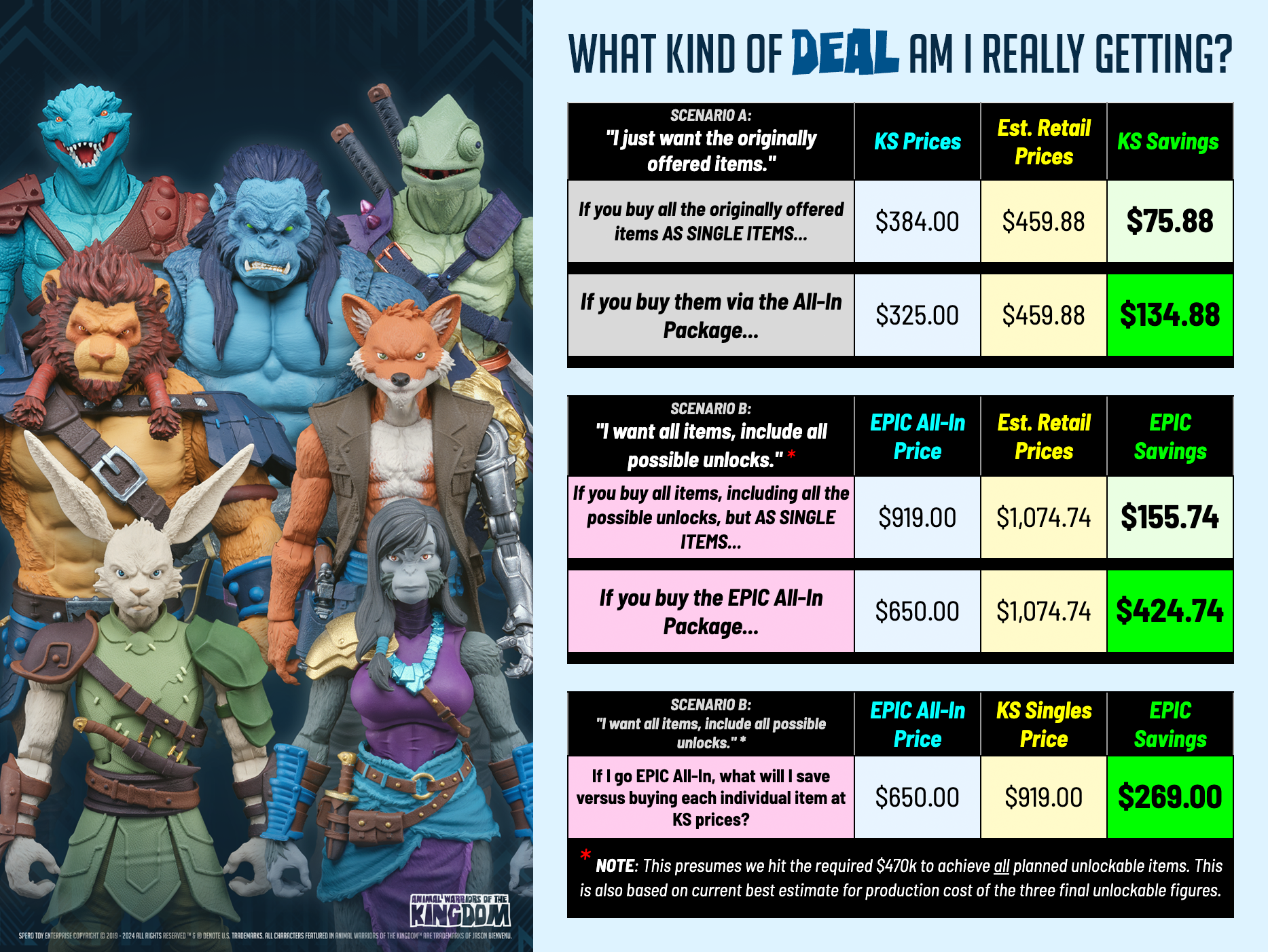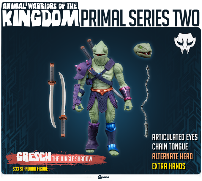 In order to incentivize collectors to take a leap of faith and invest into the Animal Warriors of the Kingdom brand, the Kickstarter is offering some serious discounts. “Standard figures” like their reptiles, females, speedsters, and birds can be backed for $33 instead of the eventual estimated retail price of $37.99. The larger “deluxe figures” like the muscular lion Hannibal, the hulking gorilla Kah Lee, and the pirate bulldog Grimes can be backed for $45 instead of the estimated retail price of $49.99. Perhaps in their most shocking move, Spero is offering an EPIC All-In Package at $650, which has the potential to include each of the 20 new figures and 6 weapons sets offered by the campaign, should every item be unlocked by reaching the $470,000 goal. Such a haul would eventually cost about $1074 at retail. Spero thinks that giving its Kickstarter backers this huge $424 discount is only the right thing to do, since their support for this campaign is truly an investment and act of profound faith in Animal Warriors of the Kingdom.